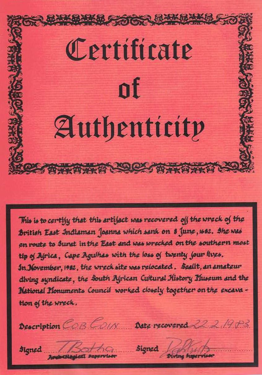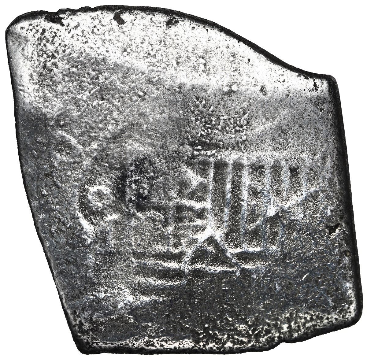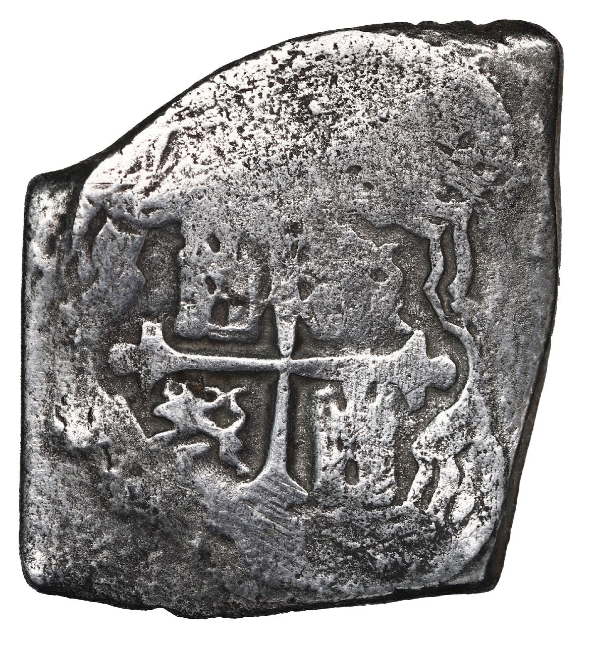 Mexico City, Mexico, cob 8 reales, 1680 L. S-M21; KM-46; Cal-641. 19.94 grams. Trapezoidal flan, typically thin from corrosion, with clear 0 of date and oML visible, good cross (nearly full). With generic certificate hand-signed by the salvors. Recovered from: Joanna, sunk in 1682 off South Africa