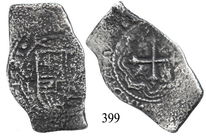 Mexico City, Mexico, cob 8 reales, 1681, oML. S-M21. 18.2 grams. Very elongated shape with full date (rare) and oML, good cross and shield, but heavily pitted all over, made better by contrasting toning. Recovered from: Joanna, sunk in 1682 off South Africa.