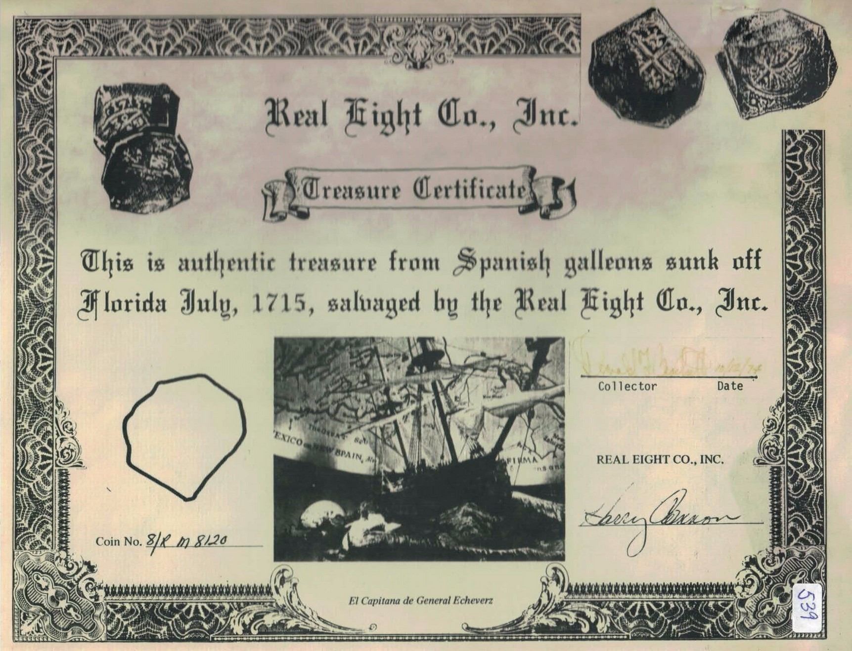 Mexico City, Mexico, cob 8 reales, (17)14(J). S-M22; KM-47; CT-743. 25.01 grams. Most of shield and cross despite weak strike, minimal corrosion, nice toning. With photocopy of Real Eight certificate, hand-signed by collector in 1974. Recovered from: Spanish 1715 Fleet, east coast of Florida