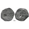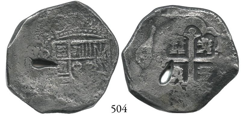 Mexico City, Mexico, cob 8 reales, (17)29(R), small natural bubble. S-M24, KM-47a, CT-754. 25.3 grams. Big, roundish flan with bold cross, most of crown and shield, weak but clear 29 of date above narrow, natural hole from bubble in original strap from which the planchet was cut, light corrosion, some toning. With certificate #AC3673. Recovered from: Rooswijk, sunk in 1739 off southeast England