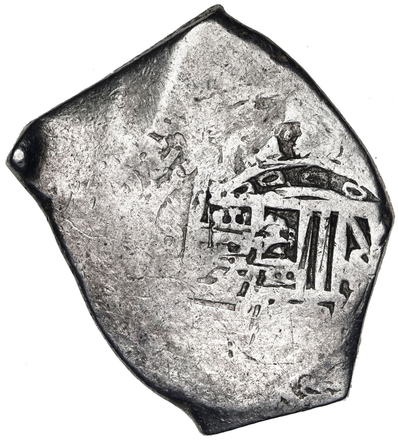 Mexico City, Mexico, cob 8 reales, 1702 (L), Philip V, rare. S-M21a; KM-47; Cal-1387. 25.32 grams. Thick flan with mostly weak strike and much peripheral flatness (most of cross, small part of shield) but remarkably clear 02 of date, technically no worse than Fine for actual wear and particularly rare as non-salvage and desirable as the first date of Charles II.