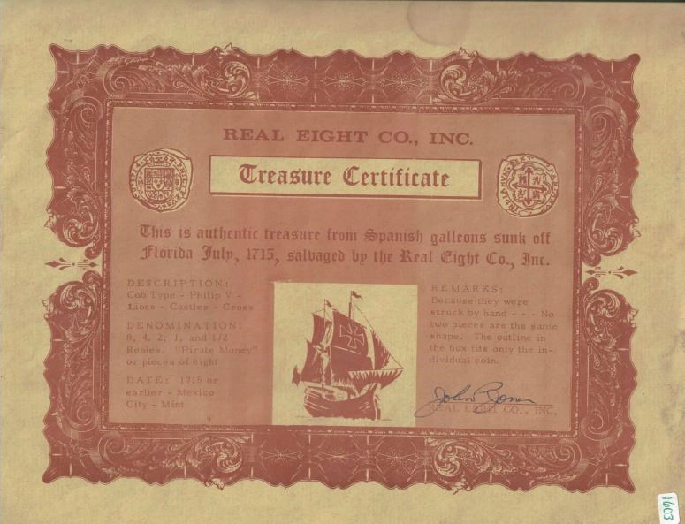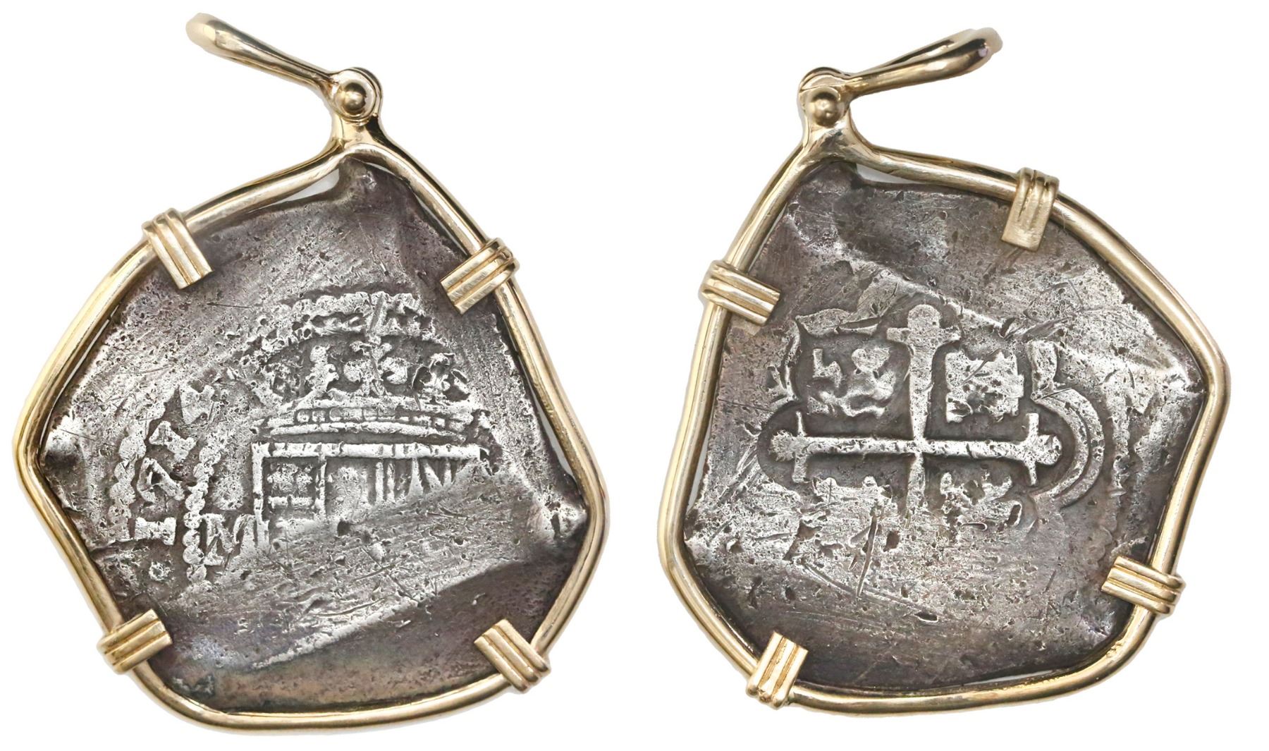 Mexico City, Mexico, cob 8 reales, 1714(J), ex-1715 Fleet, ex-Real Eight, mounted shield side out in 14K gold bezel with shackle bail. 34.73 grams total. Partial yet bold cross and shield, clear mintmark and date, dark gray contrasting toning around details. From the 1715 Fleet, with original Real Eight Co. certificate signed by John P. Jones.