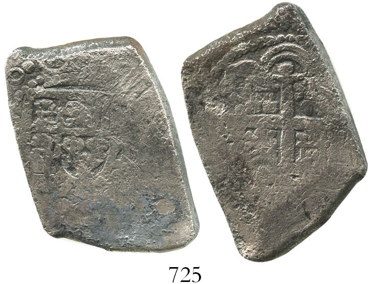 Mexico City, Mexico, cob 8 reales, (172)0(J), rare. S-M22; KM-47. 25.8 grams. Thick, rhomboid shape, with somewhat weak details (poor strike, but also lightly corroded) but clear 0 of date, patch of dark encrustation on obverse. Recovered from: Akerendam, sunk in 1725 off Norway