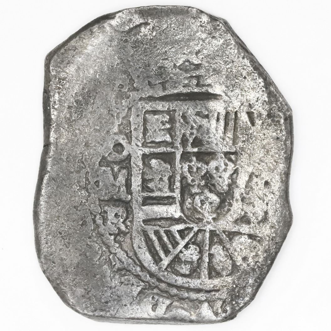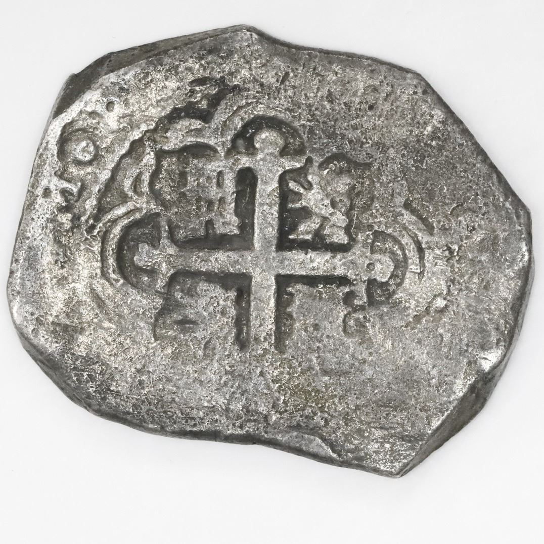 Mexico City, Mexico, cob 8 reales, (1729-30)R. S-M24; KM-47a. 25.82 grams. Nice example with light even corrosion, nearly full shield and cross with clear mintmark and assayer, darkly toned. Recovered from: Vliegenthart, sunk in 1735 off Zeeland, Netherlands