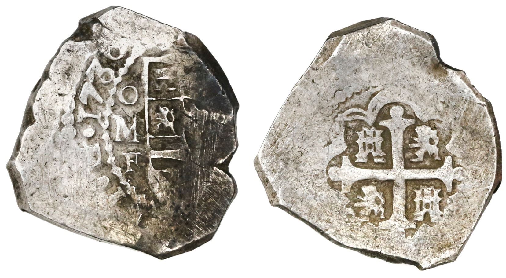 Mexico City, Mexico, cob 8 reales, 1730F. S-M26; KM-47a; CT-757. 26.99 grams. Very thick (small) flan with bold full date and oMF, choice full cross-lions-castles but shield off-center, VF with partial toning, sediment in crevices, the assayer somewhat rare for the date.