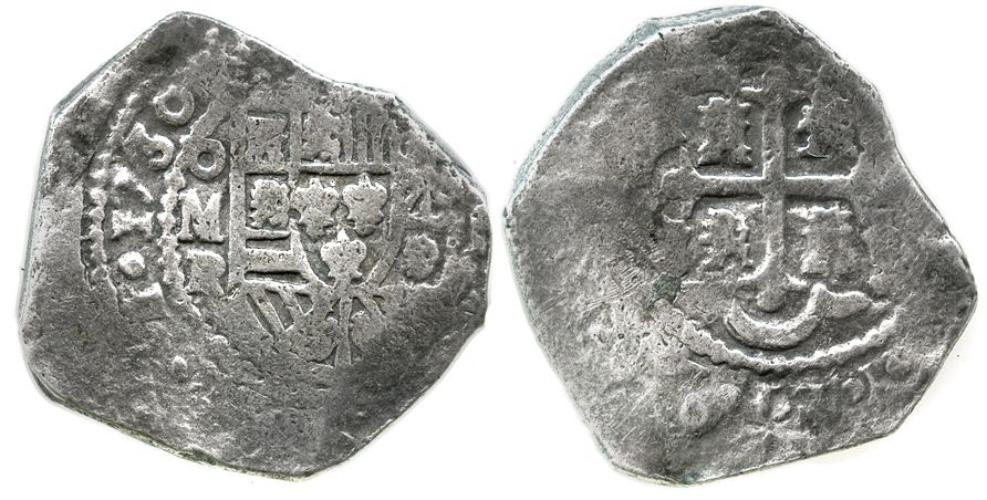 Mexico City, Mexico, cob 8 reales, 1730R. S-M24; KM-47a; CT-755. 25.7 grams. Full and bold date and oMR on an unusually broad flan with full shield and cross, some surface corrosion, toned fields. Pedigreed to the Ponterio auction of April 4-5, 1997, with certificate. Recovered from: Spanish 1733 Fleet, Florida Keys
