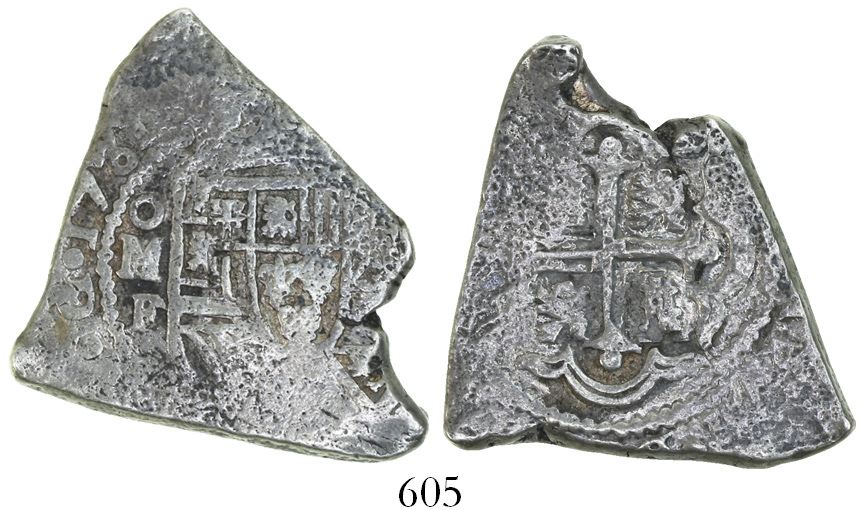 Mexico City, Mexico, cob 8 reales, 1731F. S-M26; KM-47a; CT-762. 25.93 grams. Interesting triangular shape with blunted points, full date and oMF, nearly full shield and cross, light surface corrosion, good toning. Recovered from: Vliegenthart, sunk in 1735 off Zeeland, the Netherlands