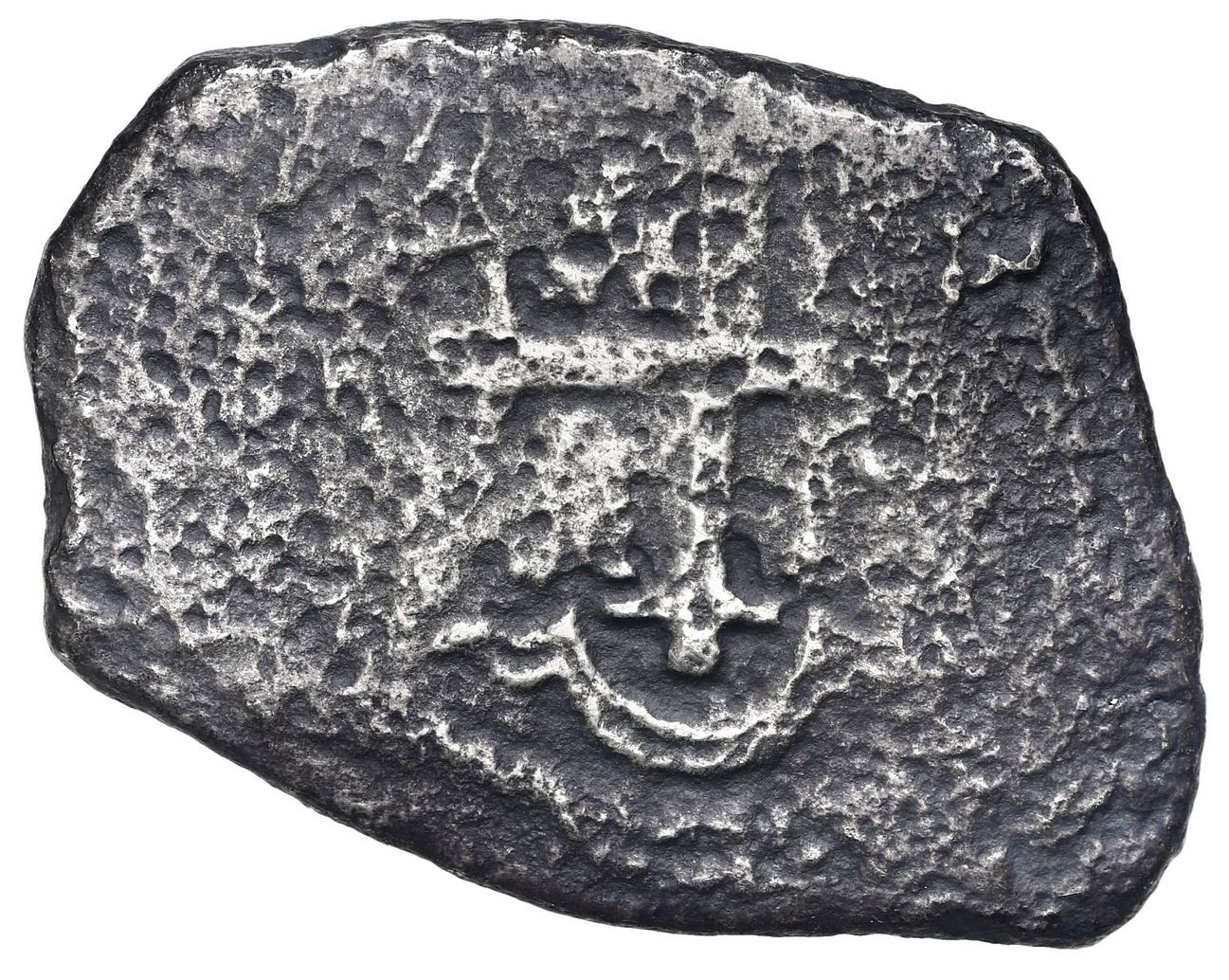 Mexico City, Mexico, cob 8 reales, 1733 F. S-M26; KM-47a; Cal-1429. 18.07 grams. Off-center obverse with full date and oMF as a result, cruder cross, moderate surface corrosion, mostly darkly toned. With photo-certificate signed by Joel Ruth. From: Spanish 1733 Fleet, Florida Keys
