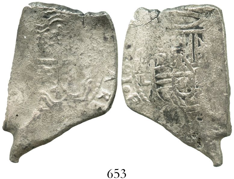 Mexico City, Mexico, cob 8 reales, Charles II, 16(??)L. S-M21; KM-46. 24.3 grams. Full assayer and 16 of date, full but weak shield and cross with light surface corrosion, spots of toning, interesting shape that greatly resembles the State of Nevada! With original (generic) certificate from the divers. Recovered from: Joanna, sunk in 1682 off South Africa