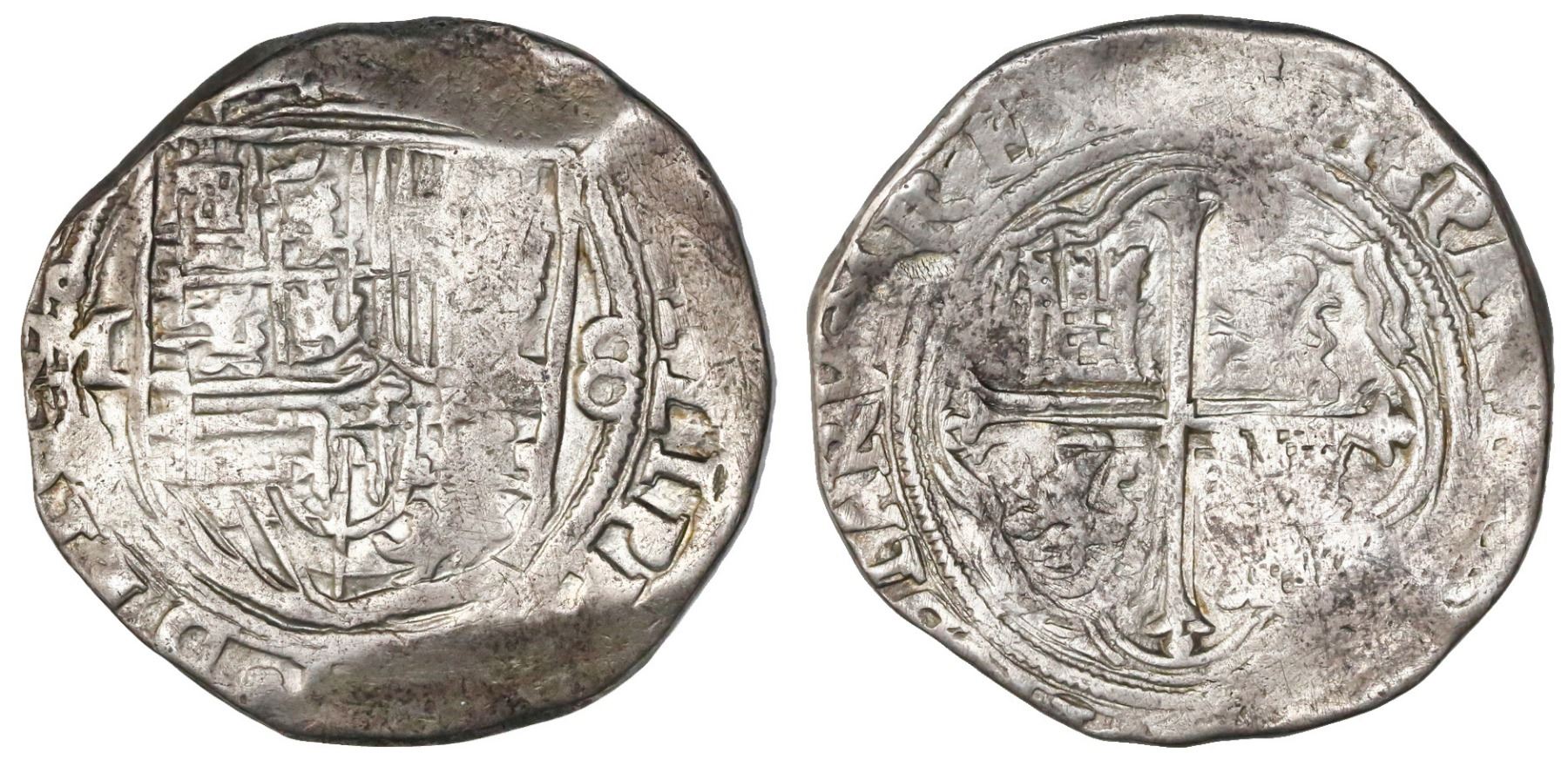 Mexico City, Mexico, cob 8 reales, Philip II, assayer O below mintmark oM to left.