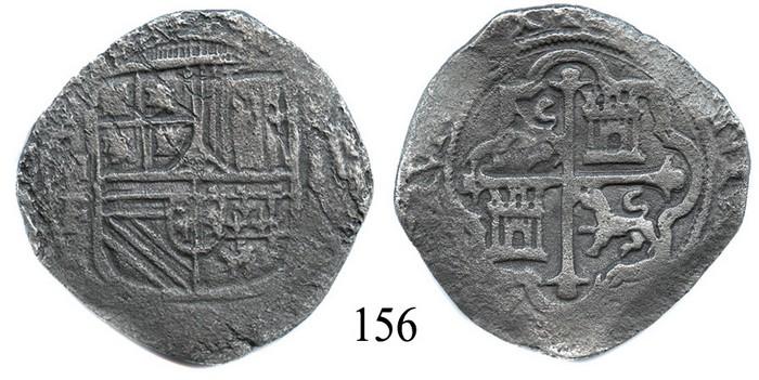 Mexico City, Mexico, cob 8 reales, Philip II or III, oMF, rare error with quadrants of cross transposed. S-M12 or 12a. 20.4 grams. Choice full cross with quadrants transposed (rare for this mint), also choice full shield, lightly corroded all over but nicely toned. Recovered from: "Rill Cove wreck," sunk ca. 1618 off Cornwall, England.