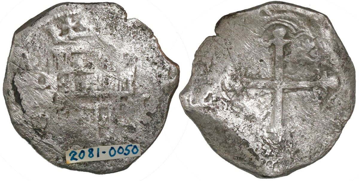 Mexico City, Mexico, cob 8 reales, Philip III, assayer D. S-M18; KM-44.3. 21.65 grams. Solid flan but with most details lost to surface corrosion and wear, the cross still clear, no toning, small sticker with Seahawk number at bottom on obverse. Pedigreed to the Charles Eidel collection, with original Seahawk certificate #91-1A-2081.0050. Recovered from: "Dry Tortugas wreck," sunk ca. 1622 off the Dry Tortugas, west of Key West, Florida