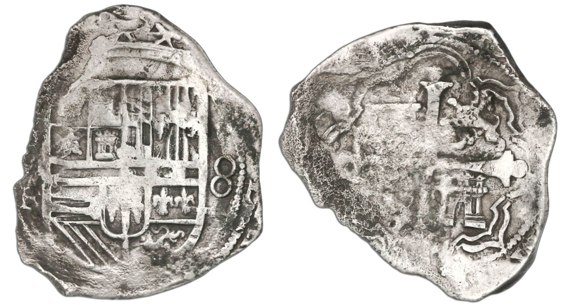 Mexico City, Mexico, cob 8 reales, Philip III, assayer F, Grade 2. 19.61 grams. Good full shield with clear assayer to left and denomination 8 to right, also full cross, heavy corrosion on part of edge, lightly toned all over. With Fisher tag and photo-certificate #7990. Recovered from: Santa Margarita, sunk in 1622 west of Key West, Florida