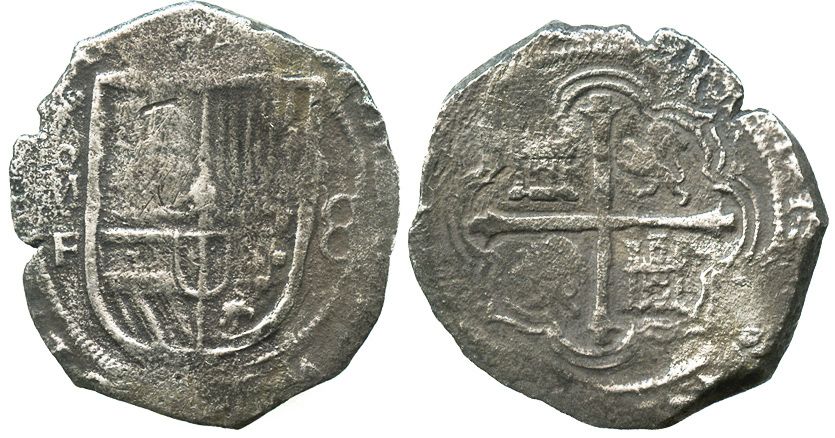Mexico City, Mexico, cob 8 reales, Philip III, assayer F. 20.3 grams. Choice full cross, bold full shield and oMF and 8, lightly corroded all over but with nicely contrasting toning. Recovered from: "Rill Cove wreck," sunk ca. 1618 off Cornwall, England