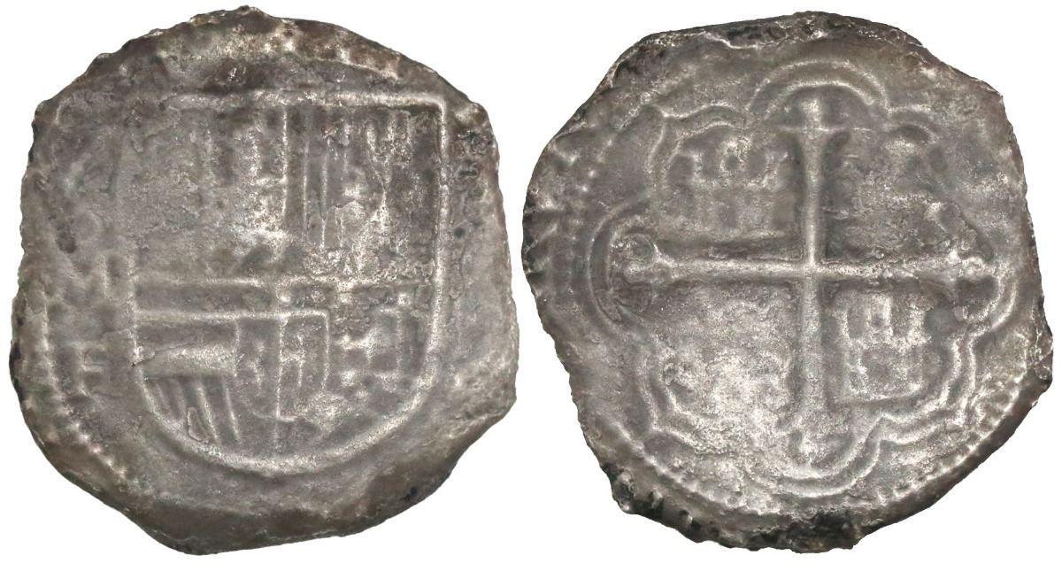 Mexico City, Mexico, cob 8 reales, Philip III, assayer F. 15.78 grams. Truncated flan due to corrosion but with choice full cross and shield, lightly toned. Pedigreed to the David Horner collection. Recovered from: San Martin, sunk in 1618 off the east coast of Florida