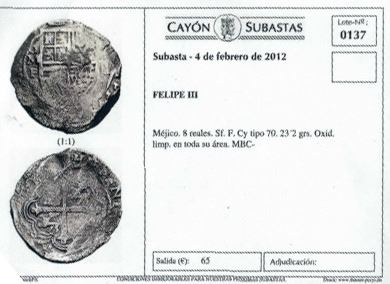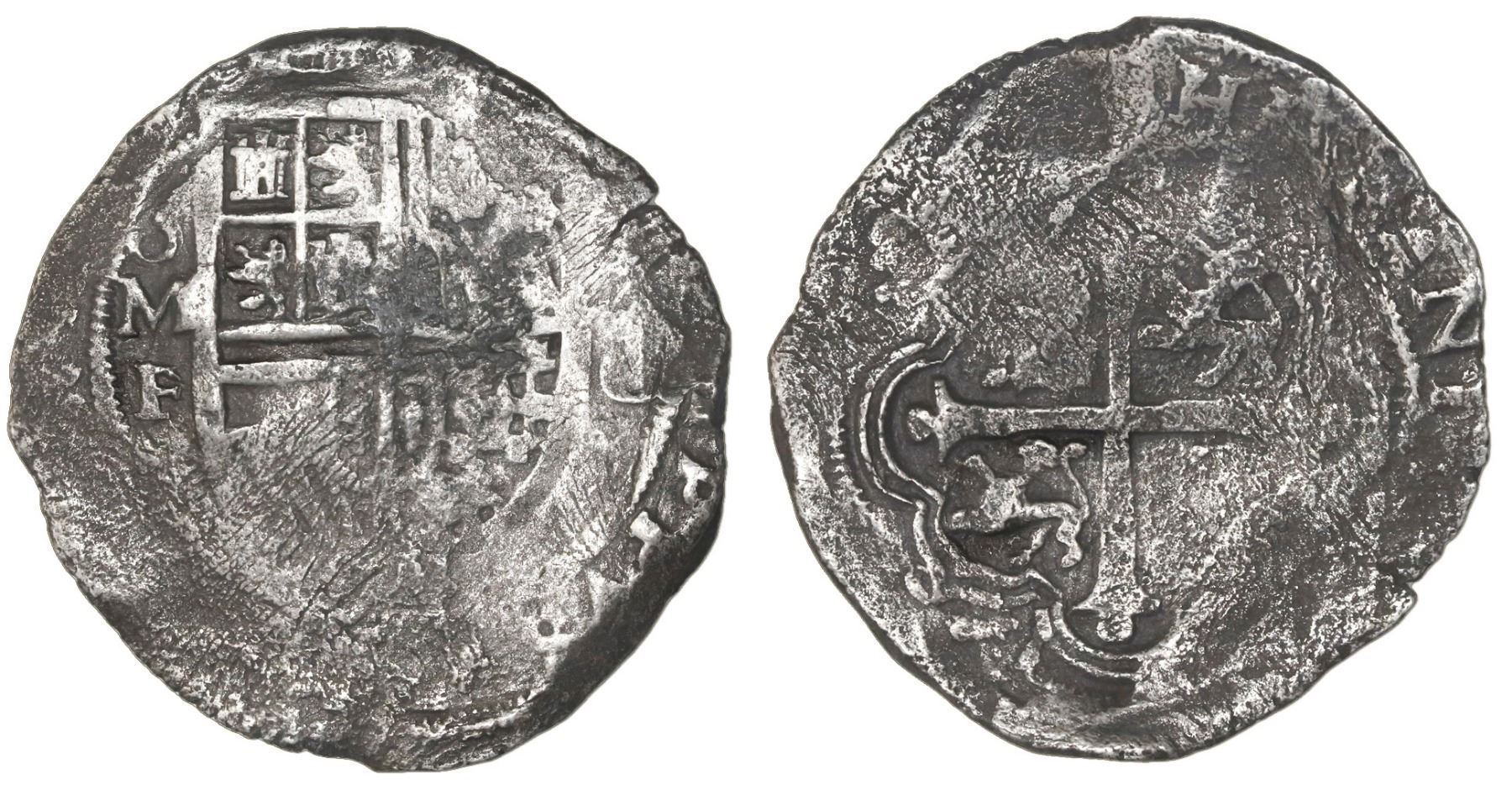 Mexico City, Mexico, cob 8 reales, Philip III, assayer F. 23.14 grams. Bold full oMF, nearly full but partially flat shield and cross, crude peripheries and edge, VF or so but with light surface corrosion (and some dark toning) as from unspecified wreck (probably "Rill Cove" of ca. 1618). Pedigreed to the Cayon auction of February 2012, with original lot-card and tag #766 plus Spanish export certificate.
