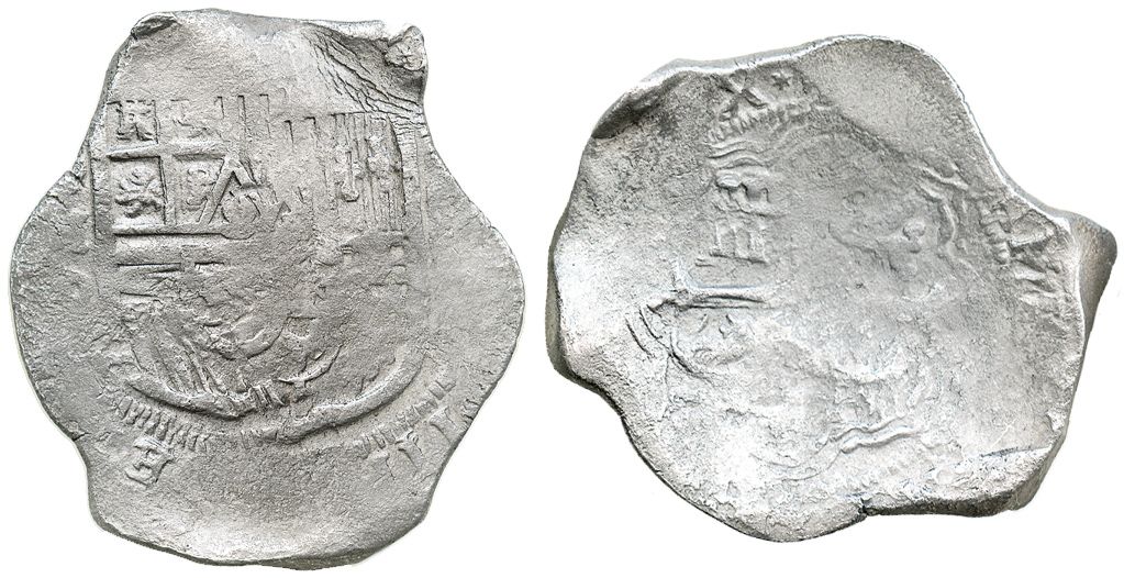 Mexico City, Mexico, cob 8 reales, Philip IV, assayer D. S-M18a; KM-45. 25.5 grams. Typically barrel-shaped flan of uneven thickness, full but weak shield and cross due to surface corrosion (otherwise VF), full king's ordinal III in legend. Probably from the "Lucayan Beach wreck" (ca. 1628).