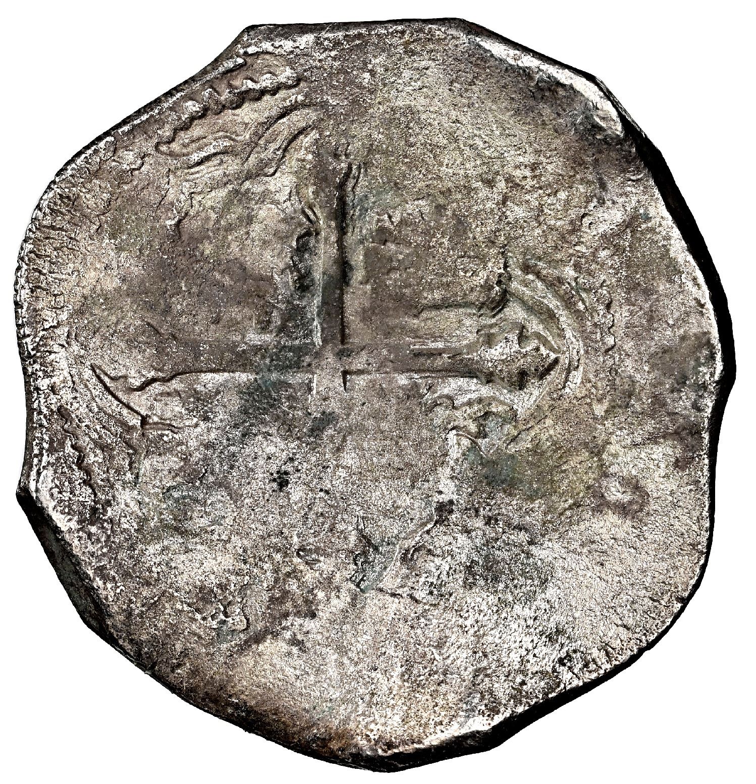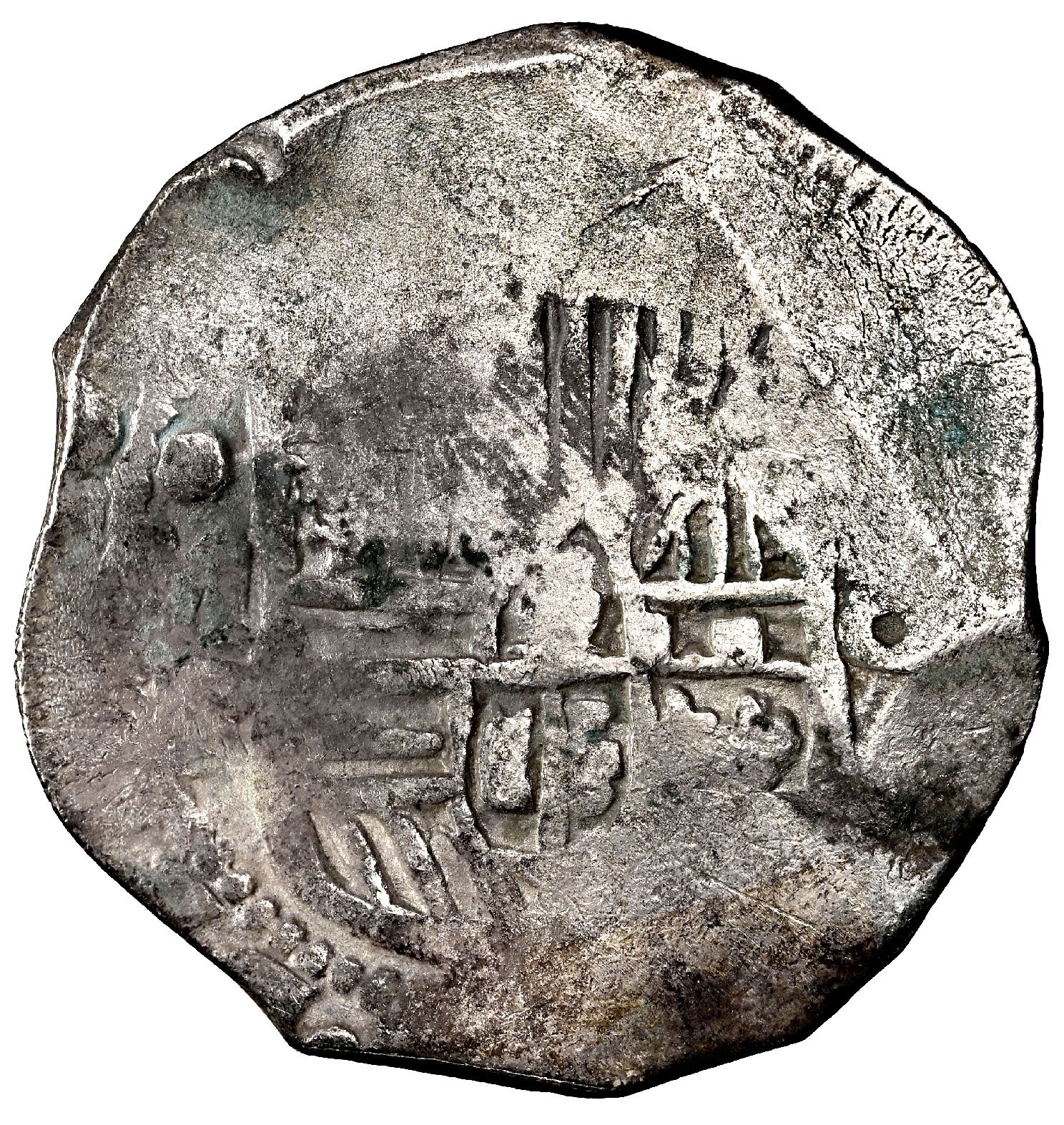 Mexico City, Mexico, cob 8 reales, Philip IV, assayer P, NGC VF details / saltwater damage / Concepcion (Shipwreck Blue Label). S-M19; KM-45. 25.58 grams. Very big round flan with extensive flatness but practically no corrosion, most of cross and shield, clear oM and bottom of 16 of date. Pedigreed to the 45th Anniversary Collection, with original tag 26031 and official (generic) Letter of Authenticity. Recovered from: Concepcion, sunk in 1641 off Hispaniola