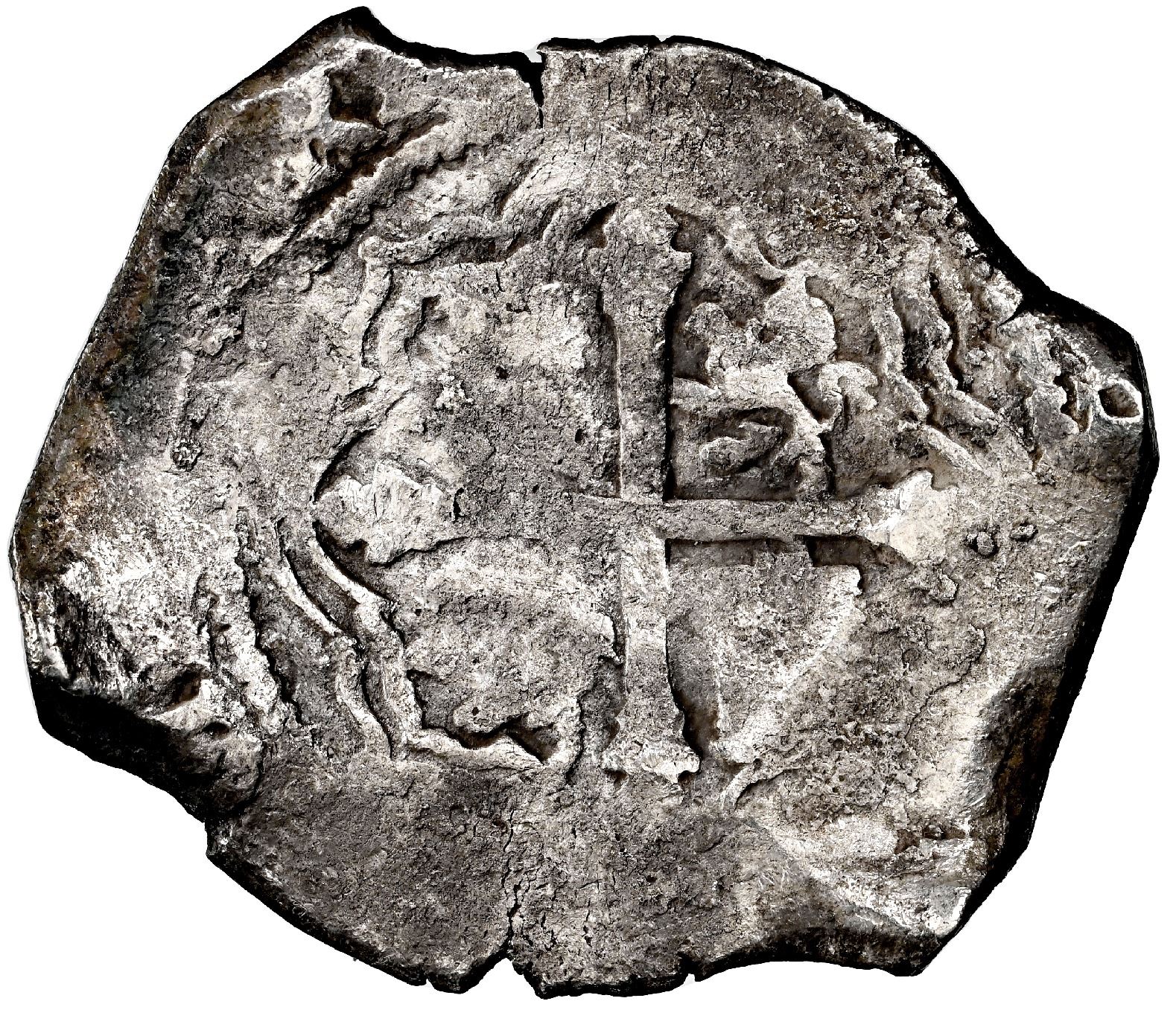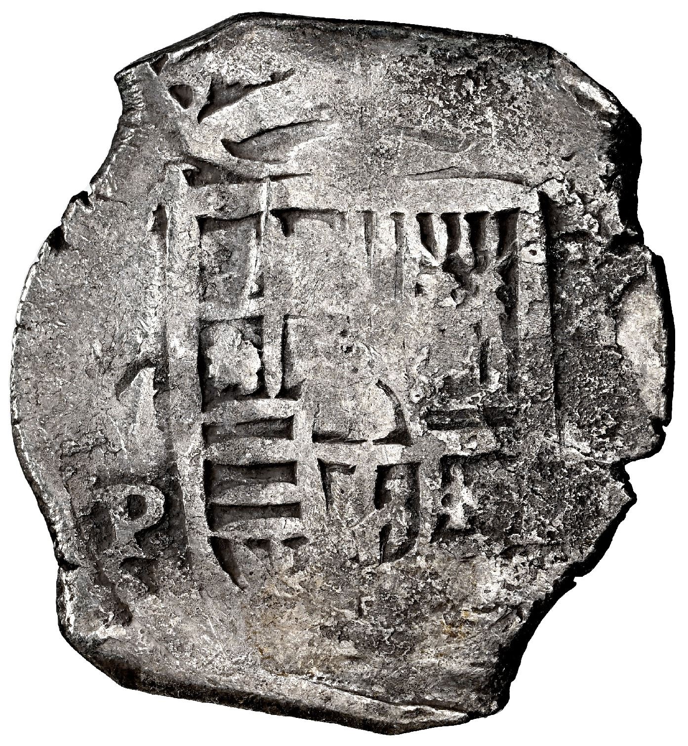 Mexico City, Mexico, cob 8 reales, Philip IV, assayer P, NGC VF details / saltwater damage / Concepcion (Shipwreck Blue Label). S-M19; KM-45. 26.16 grams. Typical barrel-shaped flan with full but slightly weak shield and cross, bold full assayer, much flatness but minimal corrosion, spotty dark toning. Pedigreed to the 45th Anniversary Collection, with original tag 26060 and official (generic) Letter of Authenticity. Recovered from: Concepcion, sunk in 1641 off Hispaniola