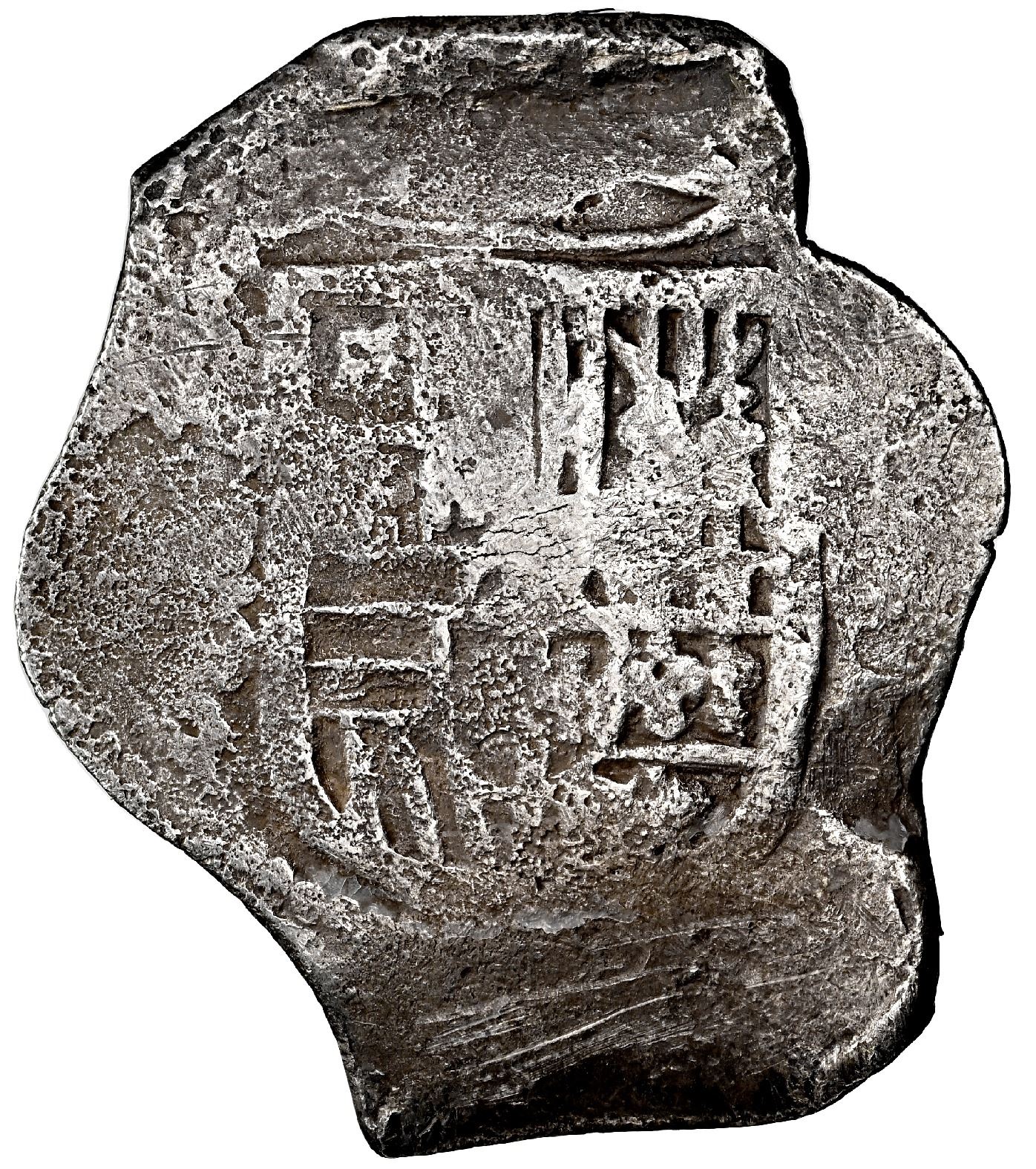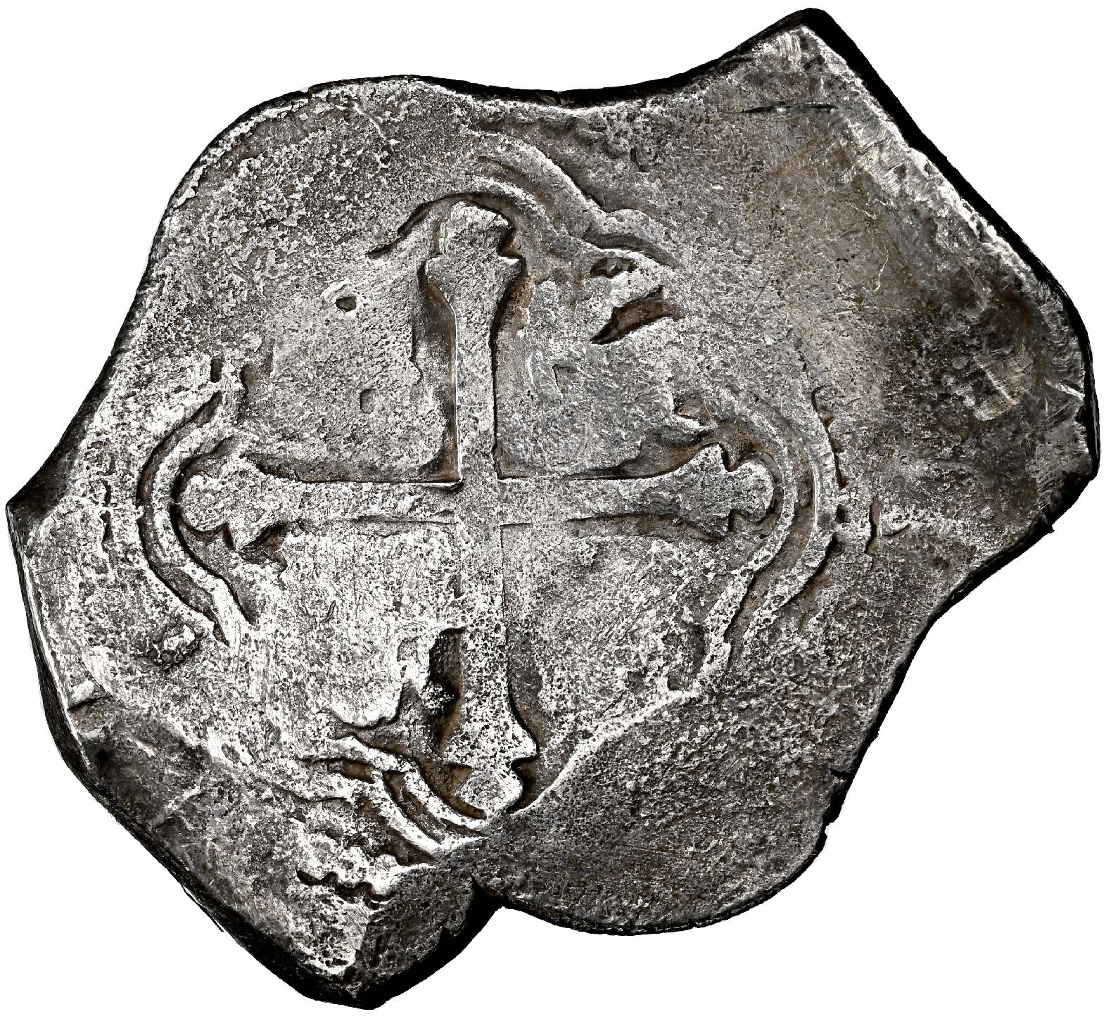 Mexico City, Mexico, cob 8 reales, Philip IV, assayer P, NGC VF details / saltwater damage / Concepcion (Shipwreck Blue Label). S-M19; KM-45. 26.54 grams. Tall barrel shape with full but slightly weak shield and cross, no peripheral details, minimal surface corrosion, lightly toned. Pedigreed to the 45th Anniversary Collection, with original tag 95031 and official (generic) Letter of Authenticity. Recovered from: Concepcion, sunk in 1641 off Hispaniola