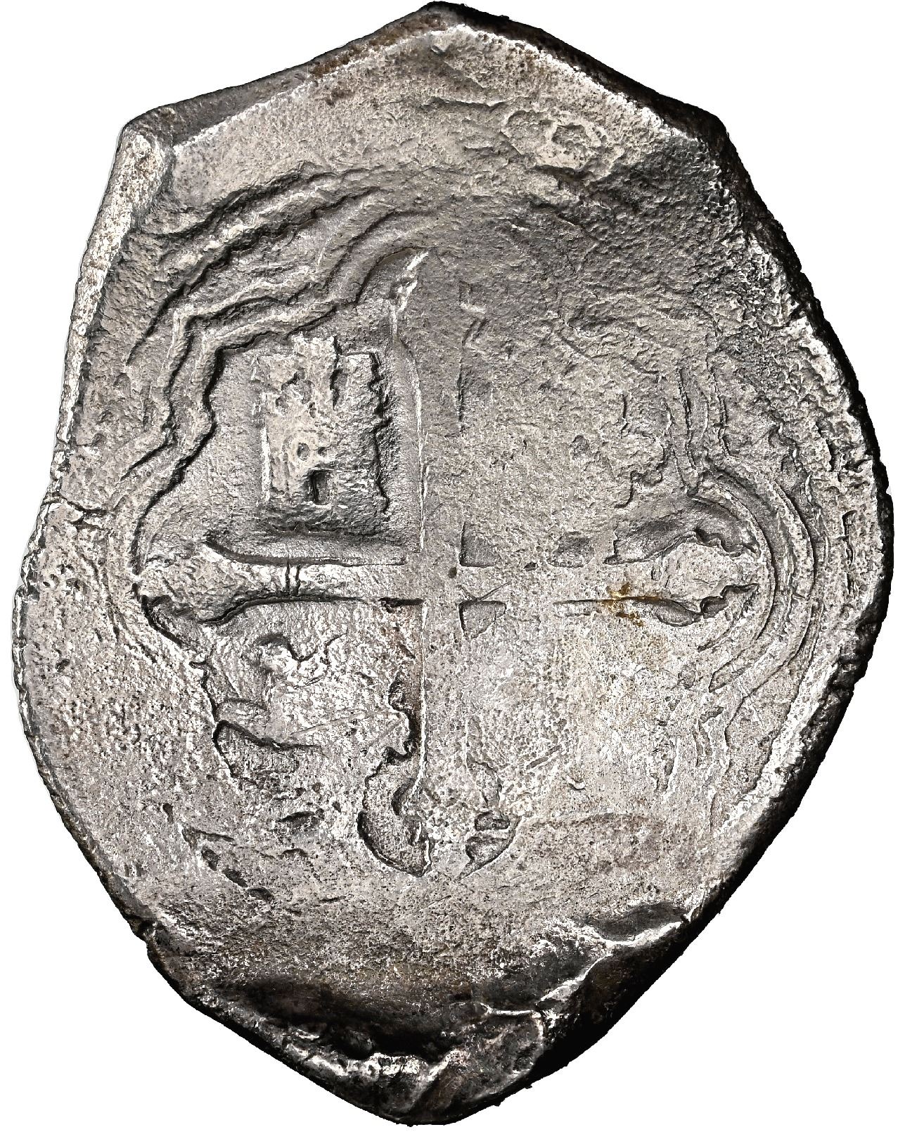 Mexico City, Mexico, cob 8 reales, Philip IV, assayer P, NGC XF details / saltwater damage / Concepcion (Shipwreck Blue Label). S-M19; KM-45. 25.64 grams. Oddly oval flan with full but weakly struck cross and shield, clear oMP and bold denomination 8, minimal corrosion, no toning. Pedigreed to the 45th Anniversary Collection, with original tag 56976 and official (generic) Letter of Authenticity. Recovered from: Concepción, sunk in 1641 off Hispaniola