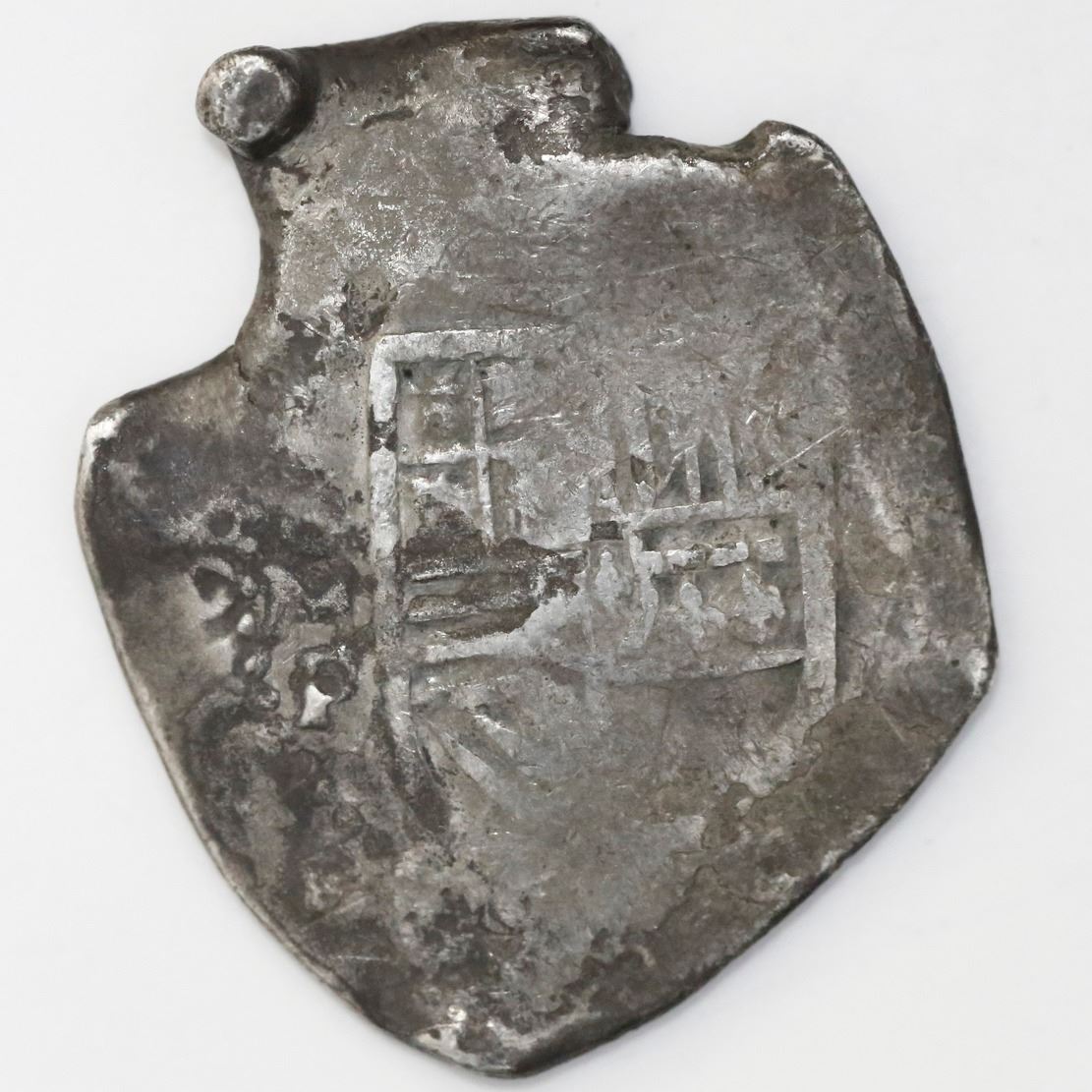 Mexico City, Mexico, cob 8 reales, Philip IV, assayer P (ca. 1660s). S-M19; KM-45. 23.55 grams. Very odd shape that resembles an olive jar, good full cross, full oMP but only VG and rather crude and with dark oxidation around edge.