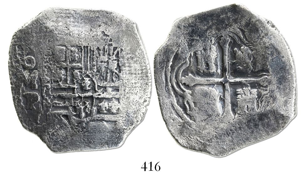 Mexico City, Mexico, cob 8 reales, Philip IV, assayer P, with canvas imprint on shield side.