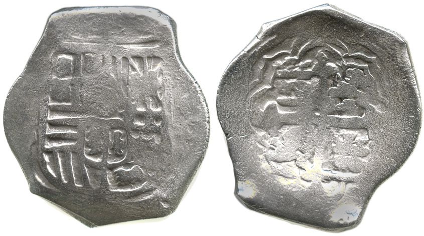Mexico City, Mexico, cob 8 reales, Philip IV, assayer P. KM-45. 25.9 grams. Silvery but solid, with full but weak shield and cross, no visible corrosion, somewhat urn-shaped. With certificate from the salvagers. Recovered from: Concepcion, sunk in 1641 off Hispaniola