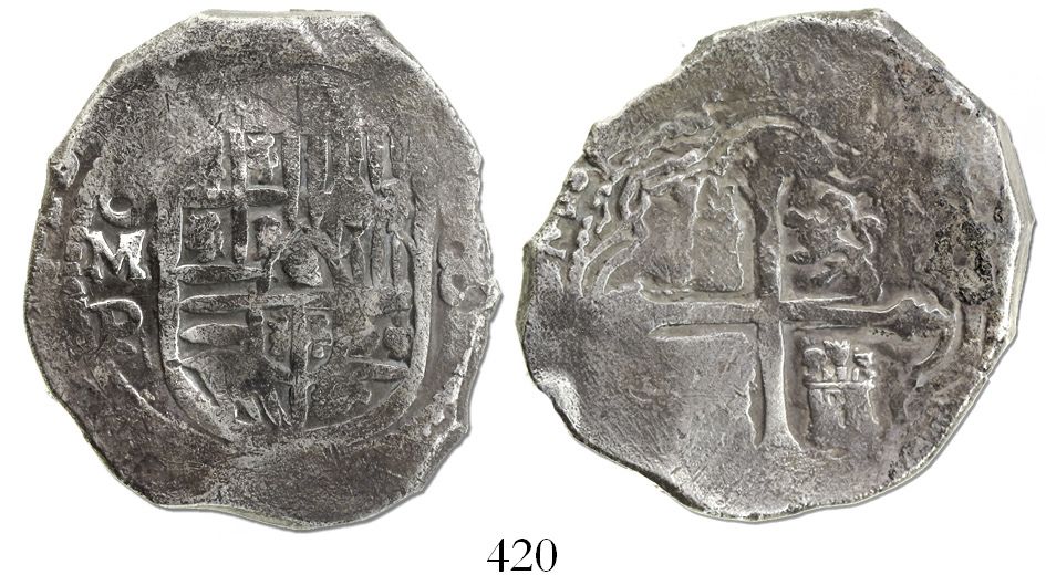 Mexico City, Mexico, cob 8 reales, Philip IV, assayer P. S-M19; KM-45. 25.61 grams. Bold oMP, good full shield and cross, nicely toned. Recovered from: Concepcion, sunk in 1641 off Hispaniola