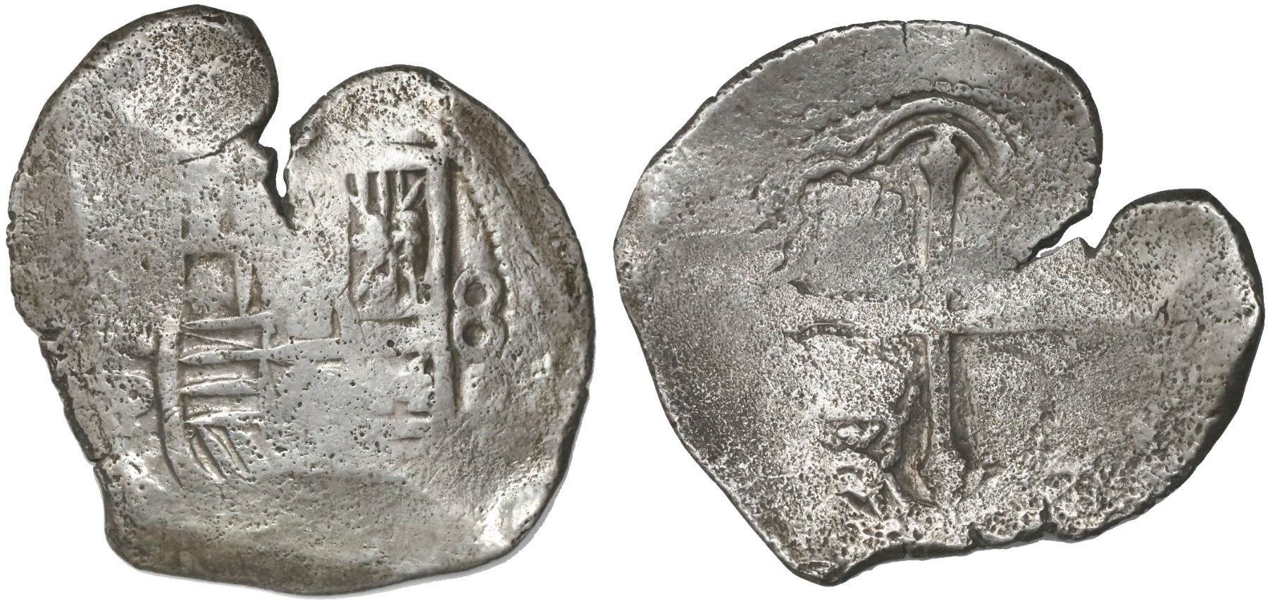 Mexico City, Mexico, cob 8 reales, Philip IV, assayer P. S-M19; KM-45. 26.01 grams. Very odd shape (looks like a boxing glove) with split in rounded end (probably a "cabo de barra"), bold denomination 8, full but weak shield and cross, minimal surface corrosion. With original (generic) certificate and tag #76976 from the salvagers, and pedigreed to our Auction #8, with original lot-tag #550. Recovered from: Concepcion, sunk in 1641 off Hispaniola