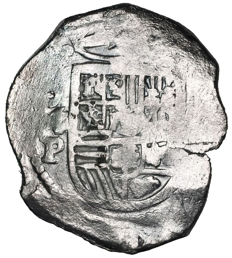 Mexico City, Mexico, cob 8 reales, Philip IV, assayer P. S-M19; KM-45; Cal-Type 319. 26.98 grams. Solid (no corrosion) but white from cleaning, with nearly full shield and cross and oMP, typically peripherally flat, hairline edge-split. From: Concepcion, sunk in 1641 off Hispaniola