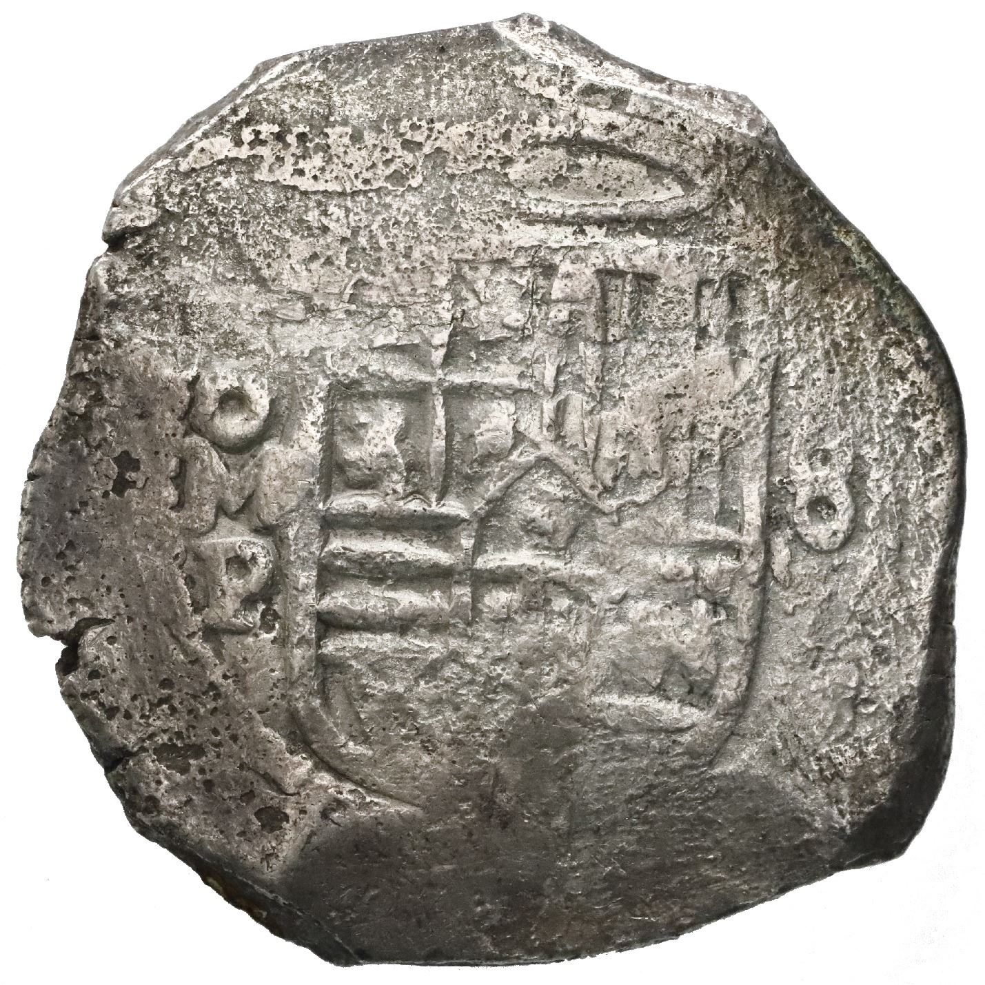 Mexico City, Mexico, cob 8 reales, Philip IV, assayer P. S-M19; KM-45. 26.26 grams. Solid coin with light surface corrosion, bold mintmark, assayer, and denomination, nearly complete shield and cross, small spot of rust encrustation on rim. With original certificate (tag) from Bahama Coin & Stamp Ltd. From: Maravillas, sunk in 1656 off Grand Bahama Island