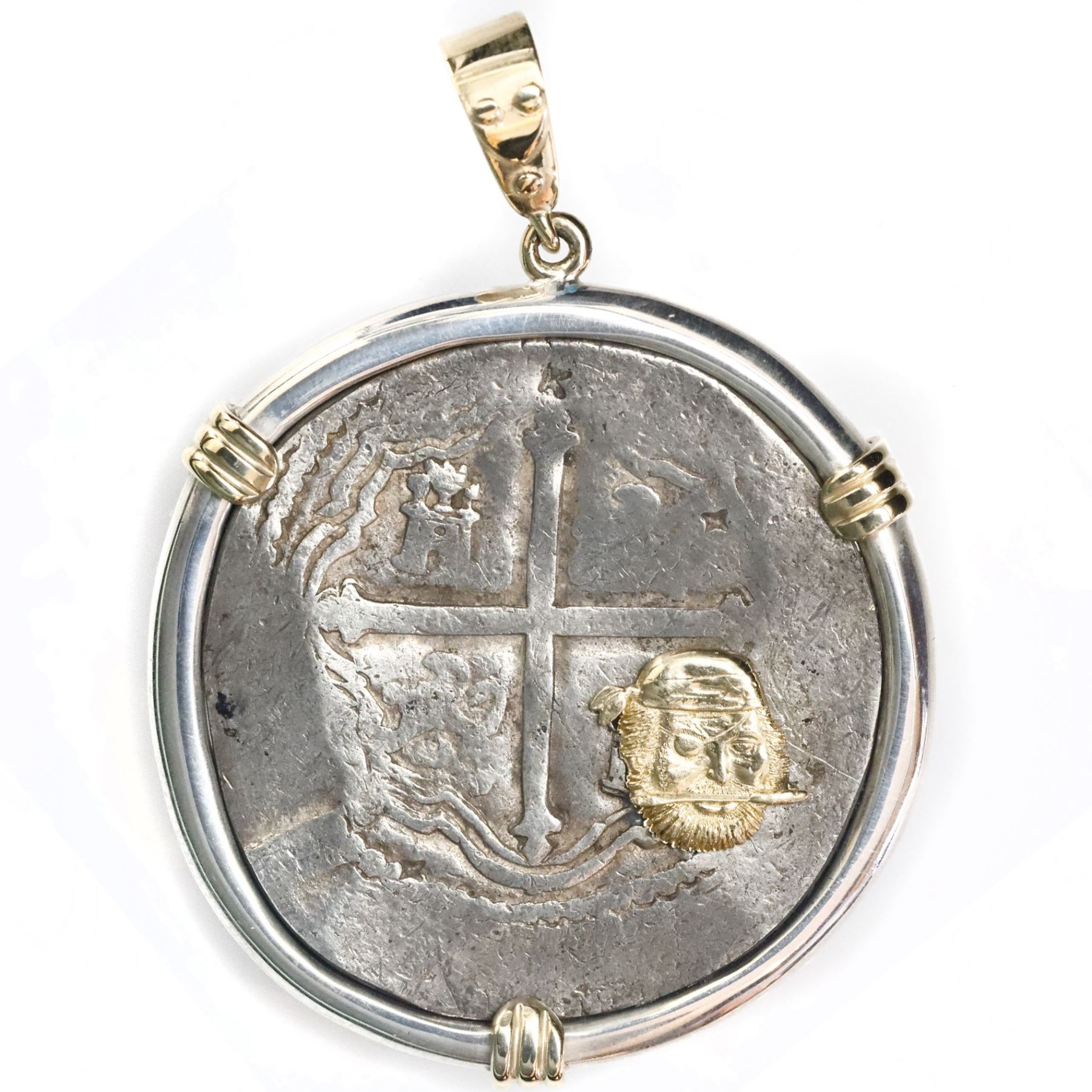 Mexico City, Mexico, cob 8 reales, Philip IV, assayer not visible (P, ca. 1640), with small chopmarks, mounted cross-side out in thick silver bezel with 14K gold prongs and shackle bail and pirate-face embellishment. 40.41 grams total. Broad-flan Fine with flat peripheries and test-cut in edge but the cross and shield but full and well detailed, bold denomination 8, just a couple tiny chops including one at the very top of the cross, thick and sturdy roundish mounting (coin edge possibly lightly shaved to fit).