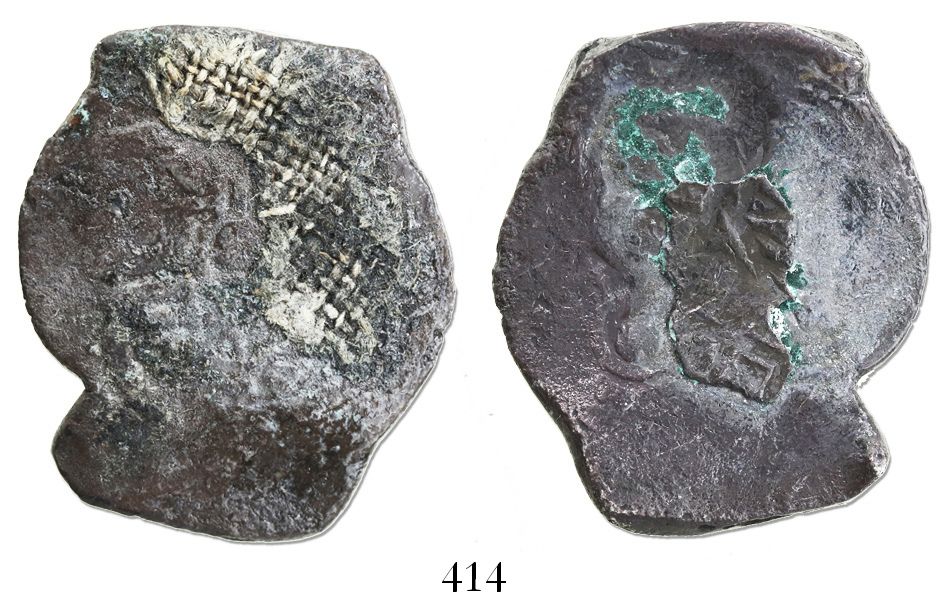 Mexico City, Mexico, cob 8 reales, Philip IV, assayer not visible (P), with canvas-bag remains on shield. S-M19; KM-45. 26.28 grams. Uncleaned specimen (leaning barrel shape) with section of original cloth appended to shield side, the coin dark all over, with spots of green on reverse. With certificate. Recovered from: Concepcion, sunk in 1641 off Hispaniola