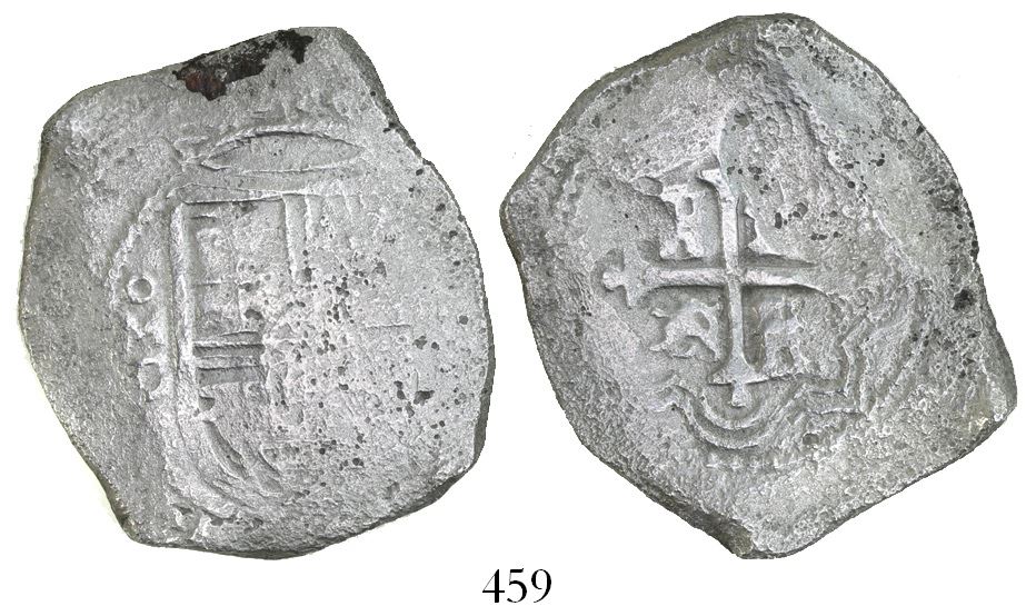 Mexico City, Mexico, cob 8 reales, Philip IV or Charles II, assayer G, rare provenance. 24.46 grams. Thick and solid, with bold cross and oMG, most of shield, but with lots of flatness and a touch of corrosion, small spot of encrustation on edge, no toning. Pedigreed to our Auction #14, with original lot-tag #469, and to our Auction #7, with original lot-tag #323. Recovered from: Spanish 1681 Fleet off Panama