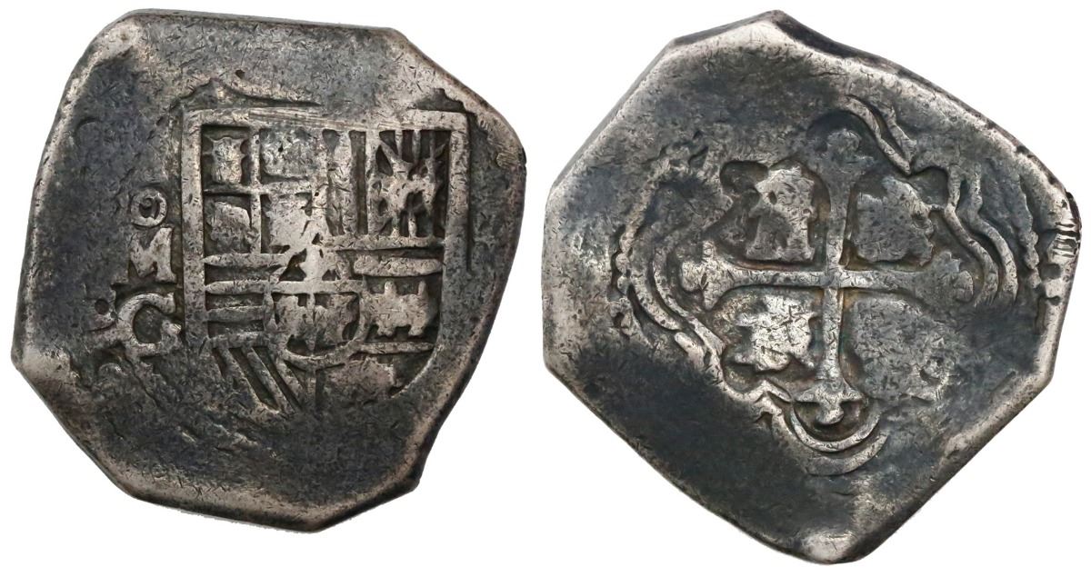 Mexico City, Mexico, cob 8 reales, Philip IV or Charles II, assayer G. 27.18 grams. Full oMG, choice full cross and shield for the grade (Fine), peripherally flat, darkly toned all over.