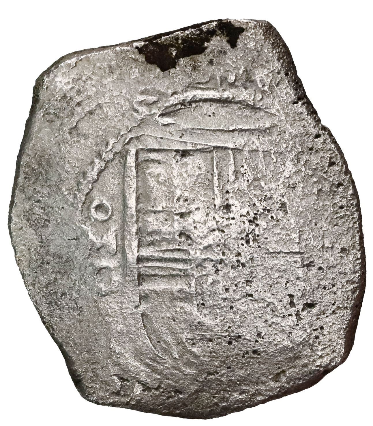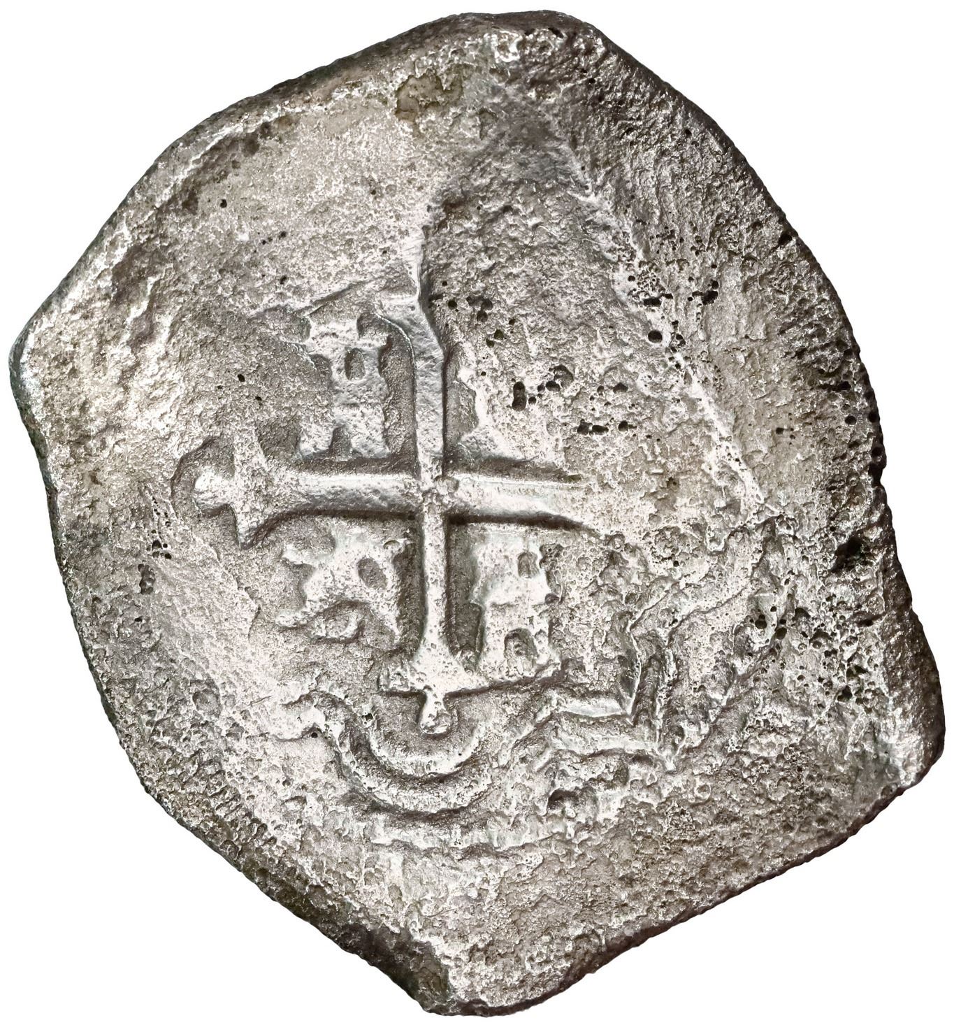 Mexico City, Mexico, cob 8 reales, Philip IV or Charles II, assayer G. 24.46 grams. Lightly pitted and silvery surfaces from unknown salvage (probably Joanna), full mintmark and assayer plus partial shield, very nice cross.