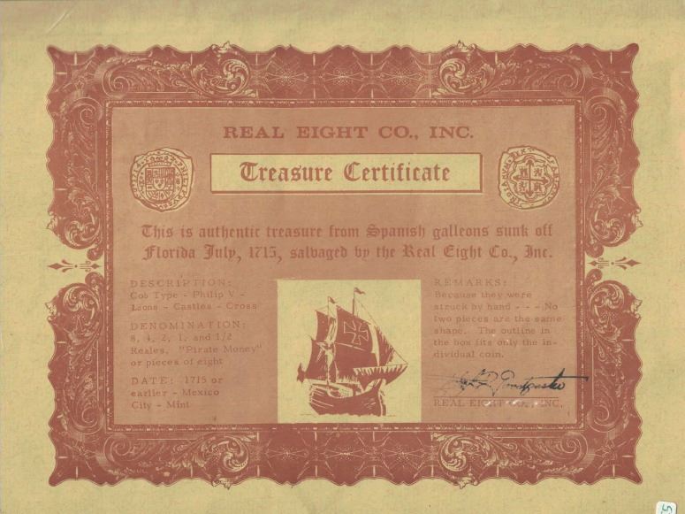 Mexico City, Mexico, cob 8 reales, Philip V, assayer J, ex-Goodpaster. S-M22; KM-47. 26.46 grams. Squarish shape with full shield and crown and denomination 8, full cross ("new style" of 1714), richly toned, virtually no corrosion. Pedigreed to the estate of Real Eight conservator Karl H. Goodpaster (our Auction #7, with original lot-tag #496), with original Real Eight certificate stamp-signed by Goodpaster. Recovered from: Spanish 1715 Fleet, east coast of Florida