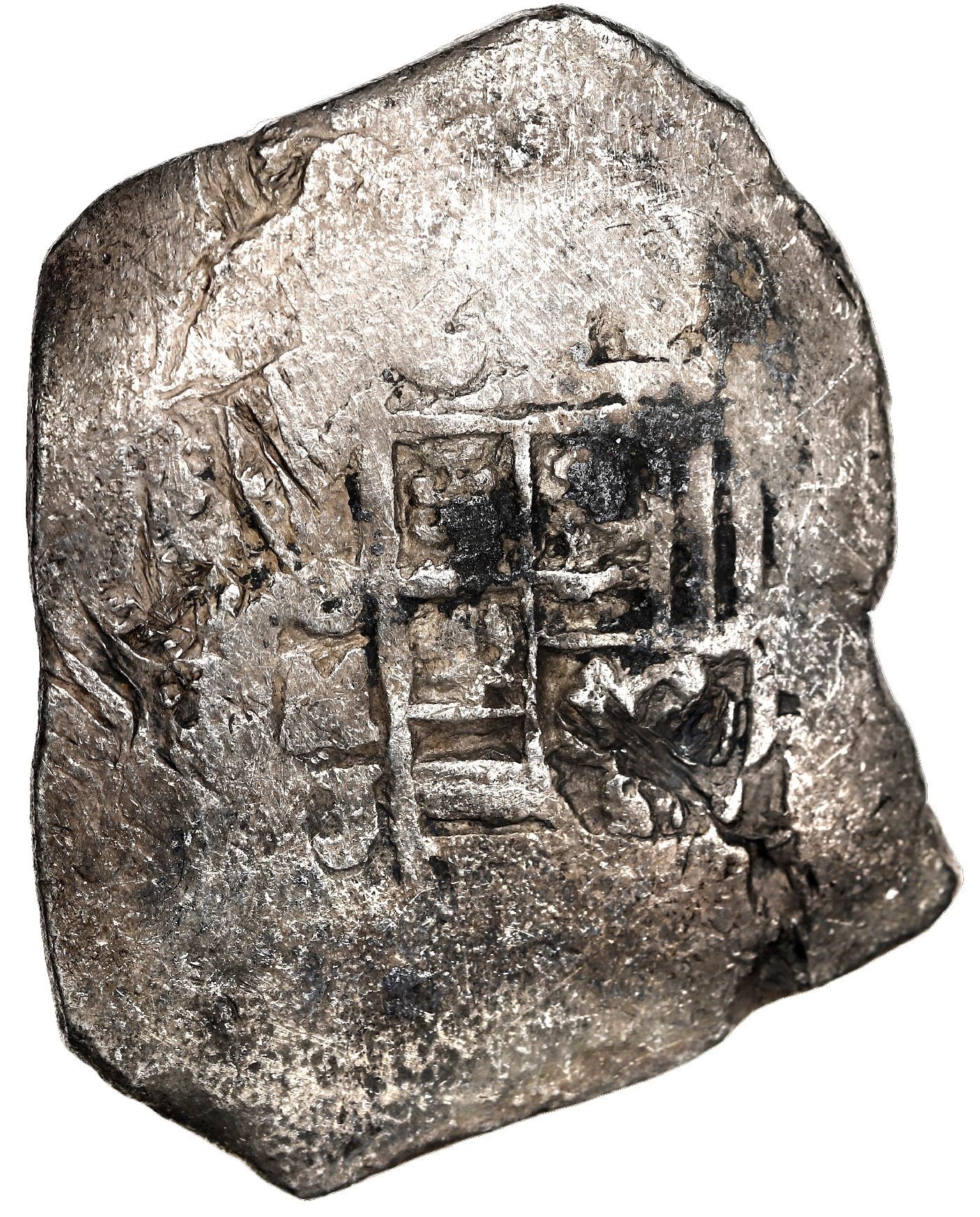 Mexico City, Mexico, cob 8 reales, Philip V, assayer J, ex-Mel Fisher. S-M22; KM-47. 25.44 grams. Very broad flan with peripheral flatness, full (weak) oMJ, most of shield and cross, minimal corrosion but some weird fissures, mostly brown-toned with patches of black. With original (small, generic) certificate hand-signed by Mel Fisher plus photo-certificate. Recovered from: Spanish 1715 Fleet, east coast of Florida