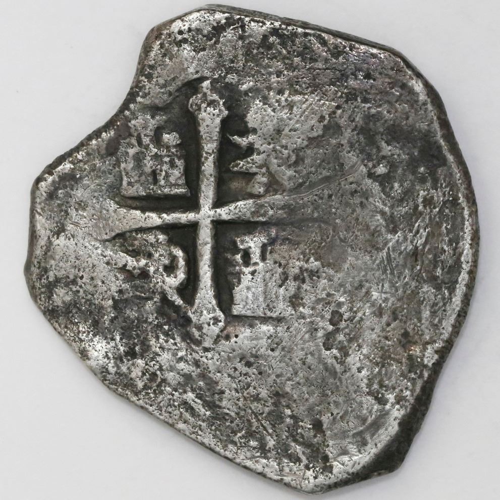 Mexico City, Mexico, cob 8 reales, Philip V, assayer J. S-M22; KM-47. 24.35 grams. Some corrosion yet detailed, full oMJ, partial date (1711?). Recovered from: Spanish 1715 Fleet, east coast of Florida