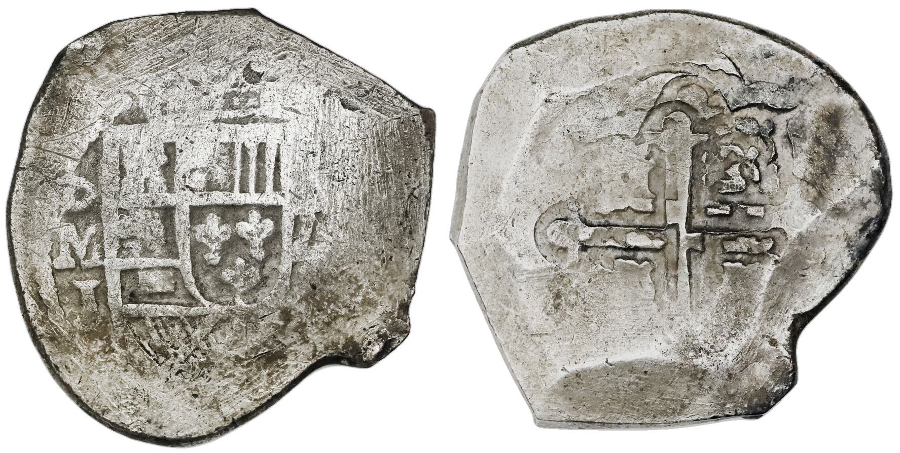 Mexico City, Mexico, cob 8 reales, Philip V, assayer J. S-M22; KM-47. 26.55 grams. Solid, roundish flan with one blunted point, full oMJ, nearly full shield and (slightly doubled) cross, no corrosion but somewhat weakly struck. Recovered from: Spanish 1715 Fleet, east coast of Florida