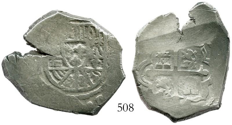 Mexico City, Mexico, cob 8 reales, Philip V, assayer J. S-M22; KM-47. 26.5 grams. Very interesting flan with large edge-crack (abnormal for this mint), good full shield, nice but softly struck full cross, very thick and solid, no corrosion. Pedigreed to the estate of Karl H. Goodpaster (Real Eight conservator), with original Real Eight Co. certificate. Recovered from: 1715 Fleet, east coast of Florida