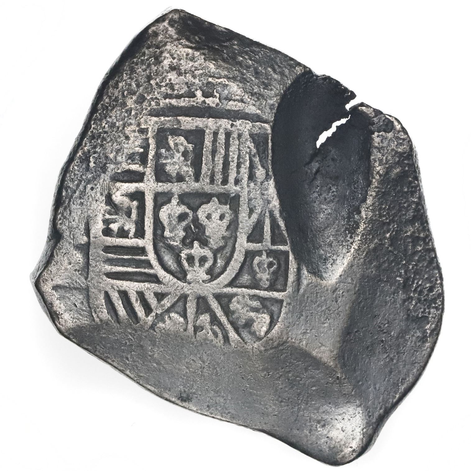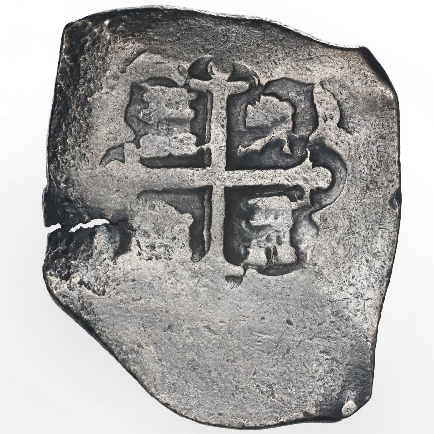 Mexico City, Mexico, cob 8 reales, Philip V, assayer R (1729-30). S-M24; KM-47a. 26.08 grams. VF with dark, lightly corroded surfaces from unspecified salvage, interesting lacuna on obverse, bold and nearly complete shield and cross. With photo-certificate.