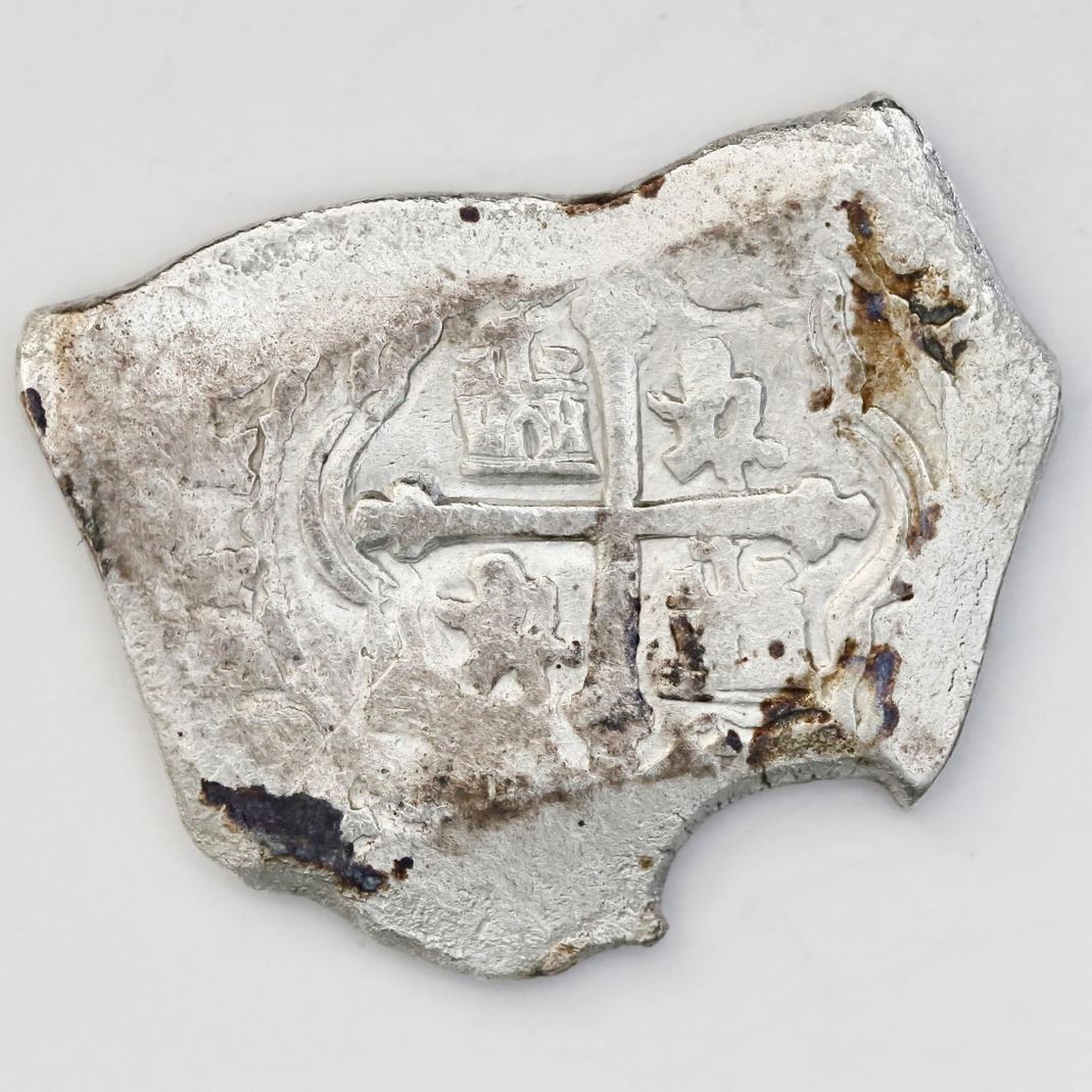 Mexico City, Mexico, cob 8 reales, Philip V, assayer not visible (ca. 1715). KM-47. 23.68 grams. Silvery (salvaged and cleaned) but with minimal surface corrosion, some dark spots, good full cross, nearly full shield with bold denomination 8.