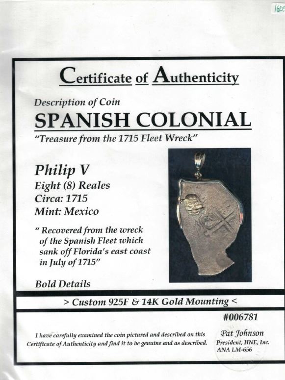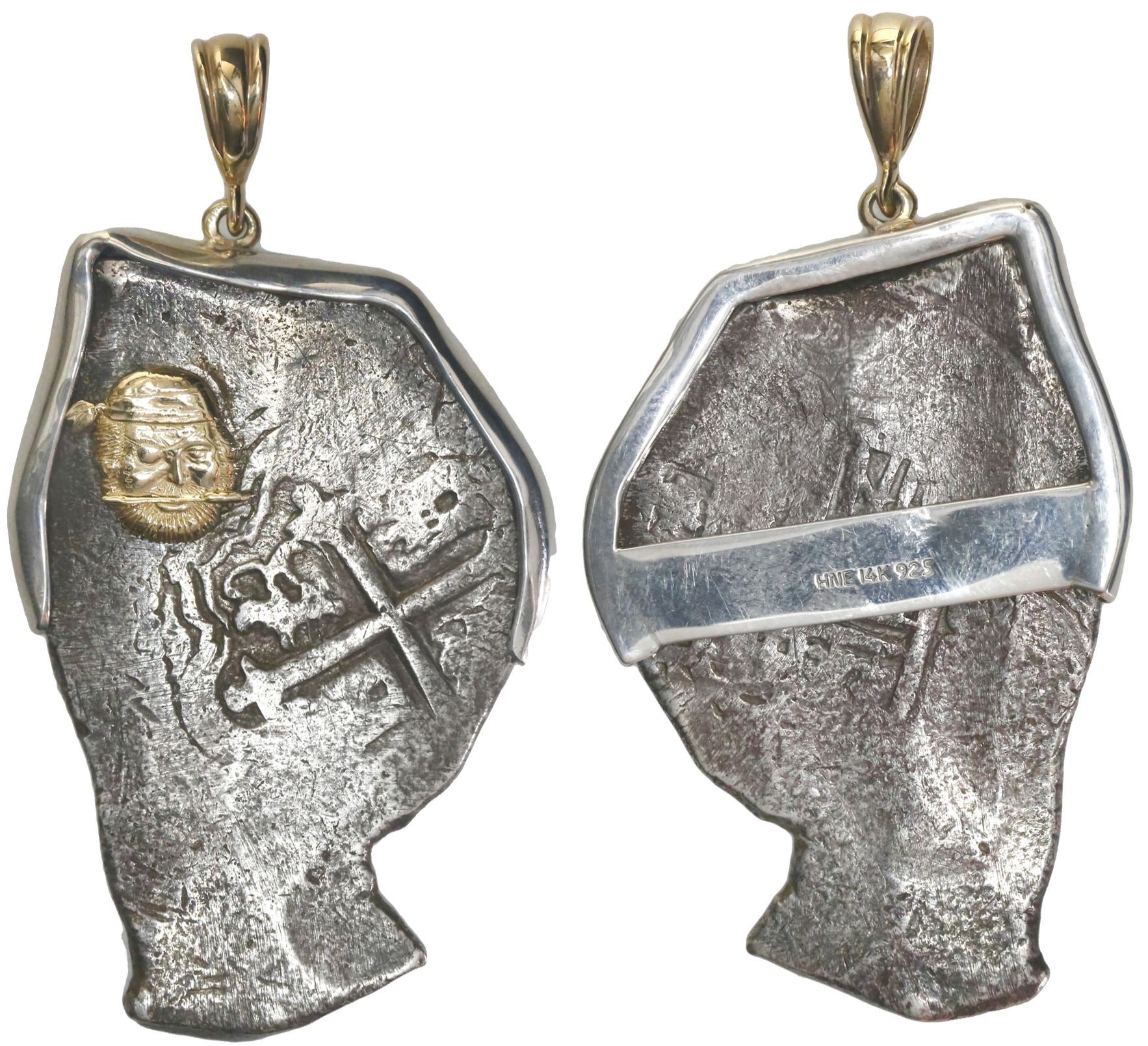 Mexico City, Mexico, cob 8 reales, Philip V, assayer not visible, ex-1715 Fleet, mounted cross-side out in silver bezel with 14K gold pirate-face embellishment and bail. 31.95 grams total. Interesting whale-shaped cob, partial cross and shield, darkly toned. From the 1715 Fleet, with photo-certificate.