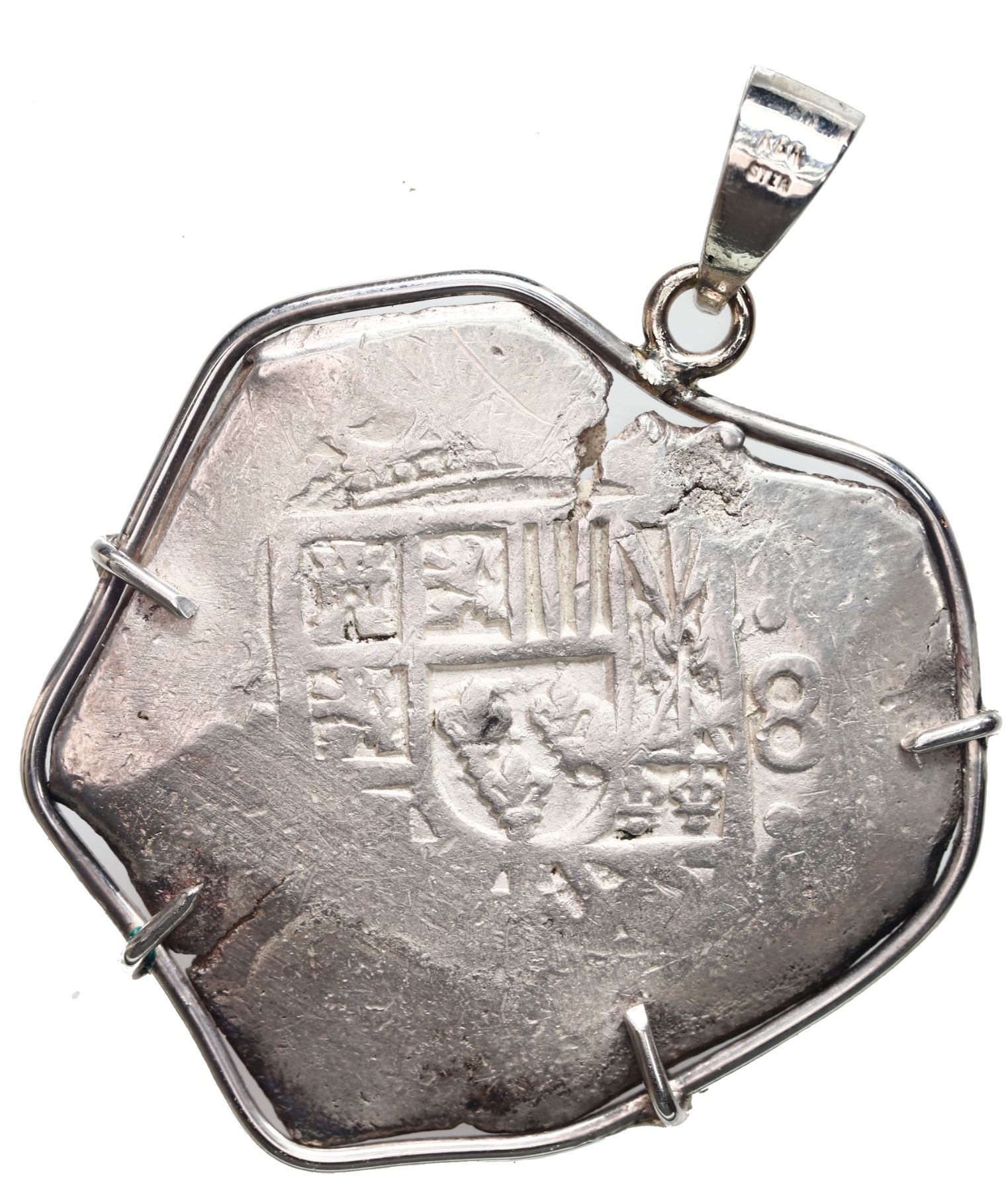 Mexico City, Mexico, cob 8 reales, Philip V, assayer not visible, ex-1715 Fleet, mounted cross-side out in silver bezel with swivel bail. 29.57 grams total. Very solid and uncorroded coin with nearly full shield and cross, bold full denomination 8, low in contrast (no toning) and with a couple small edge-cracks, very simple mounting. From the 1715 Fleet, with hand-signed Mel Fisher certificate (small) from 1966.