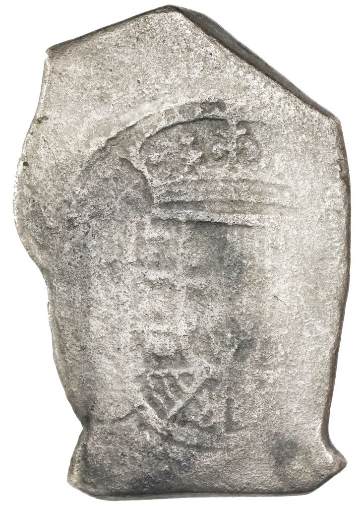 Mexico City, Mexico, cob 8 reales, Philip V, assayer not visible ("new" style of 1714J). S-M22; KM-47; Cal-1401. 22.74 grams. Nearly full (and distinctive) crown, shield and cross, lightly corroded all over, some gray toning. With Fisher photo-certificate #KF523-04. Recovered from: Spanish 1715 Fleet, east coast of Florida