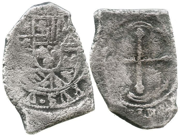 Mexico City, Mexico, cob 8 reales, Philip V, assayer not visible (style of L, 1702-1705). S-M21a; KM-47. 21.1 grams. Good full shield with bold -PVS.V (king's name and ordinal) in legend at bottom, full cross, light surface corrosion all over but with nicely contrasting toning. Recovered from: Spanish 1715 Fleet, east coast of Florida