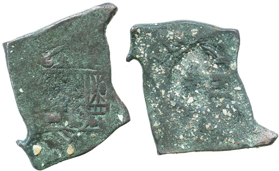 Mexico City, Mexico, cob 8 reales, Philip V, assayer not visible, uncleaned "greenie" (encrusted with shell bits, as found). KM-47. 26.3 grams. Very interesting shape (impossible to describe), with just enough shield-side details showing to identify the king, the cross side loaded with encrustation and shells but also with natural pit (bubble in the metal) in center, very solid overall. From the Hurricane Jeanne find of 2004, with photo-certificate from the finder. Recovered from: Spanish 1715 Fleet, east coast of Florida