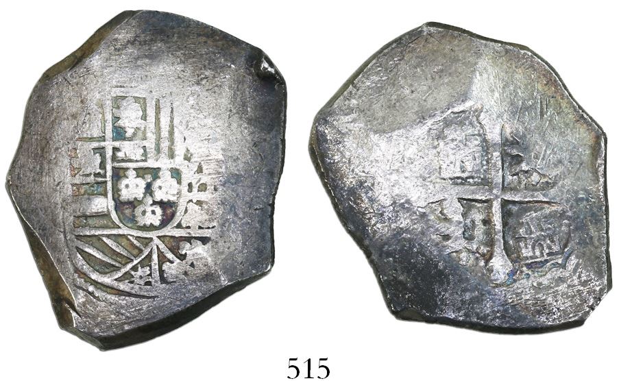 Mexico City, Mexico, cob 8 reales, Philip V, assayer not visible. KM-47. 26.38 grams. Good full shield and cross, nicely toned, with typical peripheral flatness but no corrosion. Recovered from: Spanish 1715 Fleet, east coast of Florida
